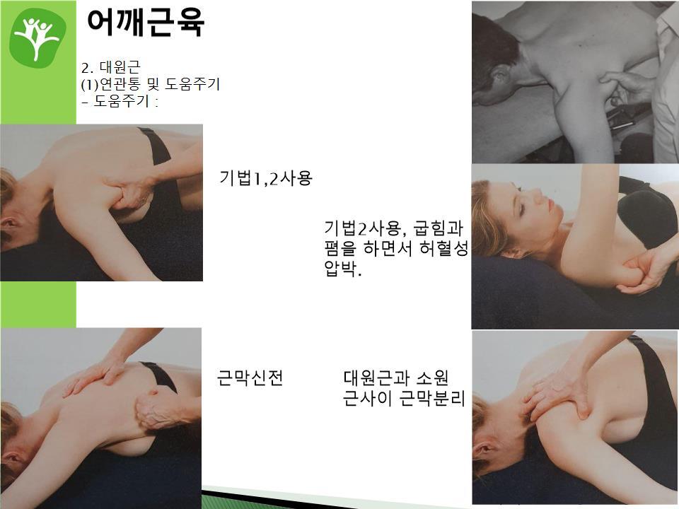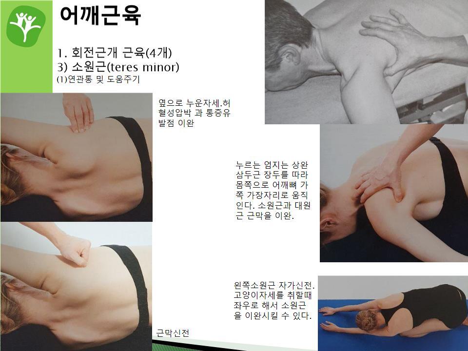 위슬라이드 오른쪽 아래 세로로 누운 상태에서 견갑골 내측연을 등에서 부터 따라 쯕 만져 줍니다. 이런 동작을 자세를 편안하게 잡게 하고 시행자가 손가락 힘만이 아닌 몸의 힘을 실어서 하는게 부드럽게 하고 효과도 좋습니다.