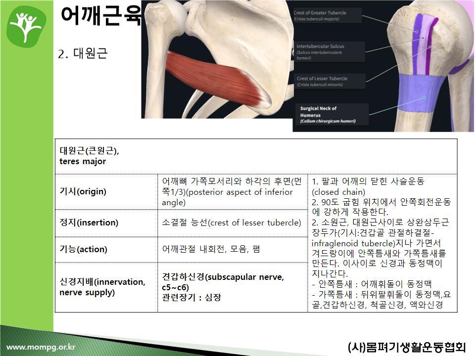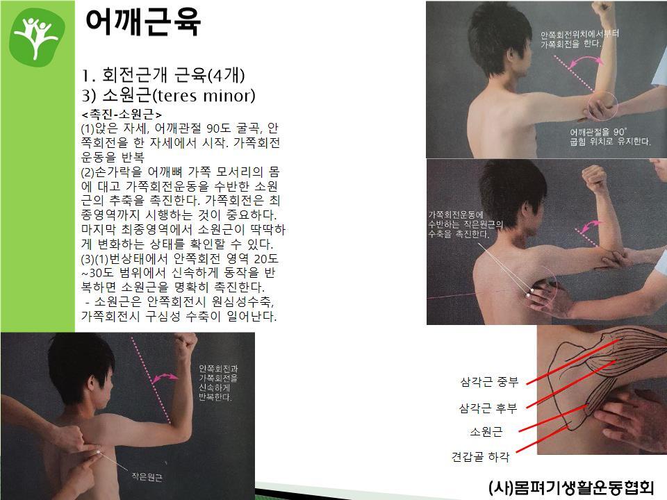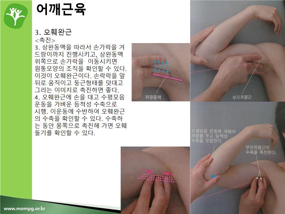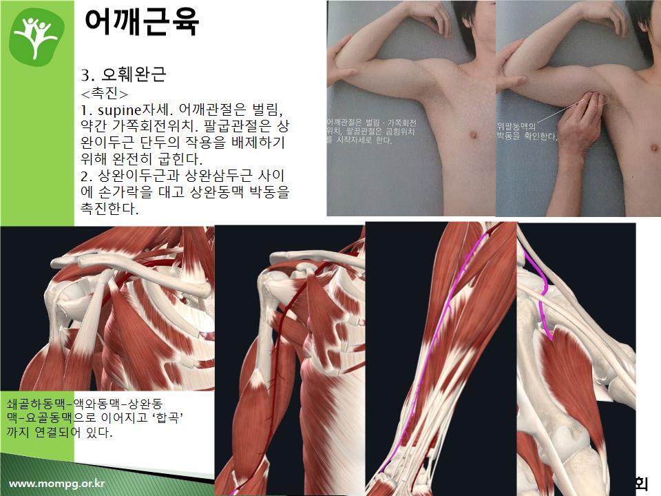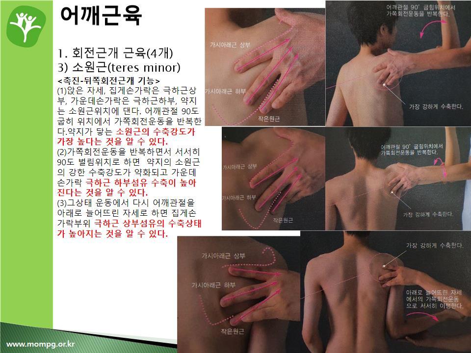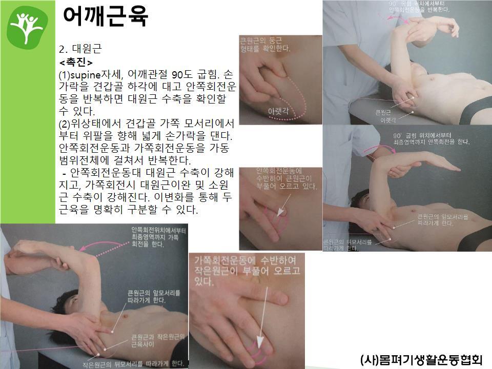 촉진시는 견갑하근, 광배근이 아니라 대원근 위치를 찾아 만지셔야...팔의 앞쪽 견갑하근 아래 대원근이 부착되어 있습니다.