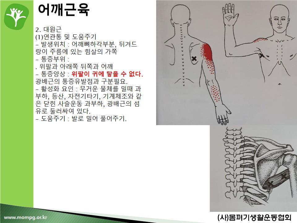 그리고 대원근과 오훼완근까지 진도를 나갑습니다. 중간에 근육설명에 닫힌사슬운동, 열린사슬운동이 있어 이 두가지 운동에 대한 설명도 추가 되어 있습니다. 몸펴기운동의 13개 동작중에 대표적인 단힌 사슬운동은 무엇이며, 열린사슬운동은 어떤 동작일까요? 이 강의 자료를 보시면 답을 알게 됩니다.