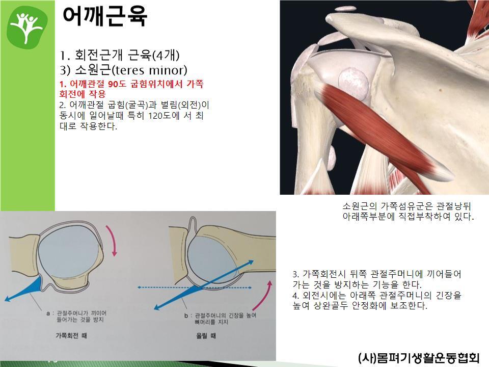 어깨복합체강의 4월 4일 일요일 2시에 진행된 강의 입니다. 소원근, 견갑하근을 해서 이전에 올린 극상근, 극하근과 함께 회전근개 4개근육을 마칩니다. 대원근이 회전근개에는 들어가지 않습니다. 소원근은 들어가는데 왜 대원근 회전근개에 들어가지 않는지? 그것은 대원근이 상완골두의 둘레를 타고 소결절과 대결절(윗면, 중간면, 아래면)에 붙는 근육이 아니기 때문에 그렇습니다. 대원근은 소결절에 붙는 견갑하근 아래의 앞쪽에 붙는 근육이고 소원근은 대결절의 아래면에 붙는 근육입니다. 그래서 기능도 대원근은 내회전, 소원근은 외회전에 주로 작동하는 근육입니다.