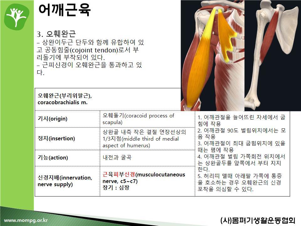 아래 오훼완근은 소흉근과 상완이두근 단두와 함께 오훼돌기(coracoid process)에 부착되어 있는 3가지 근육중 하나 입니다.