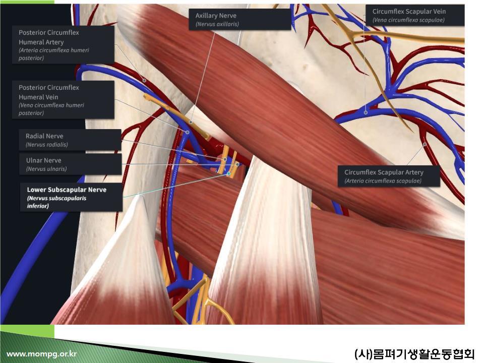 소원근 대원근 사이 혈관과 신경등을 보여줍니다.