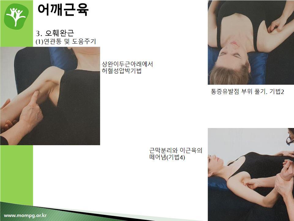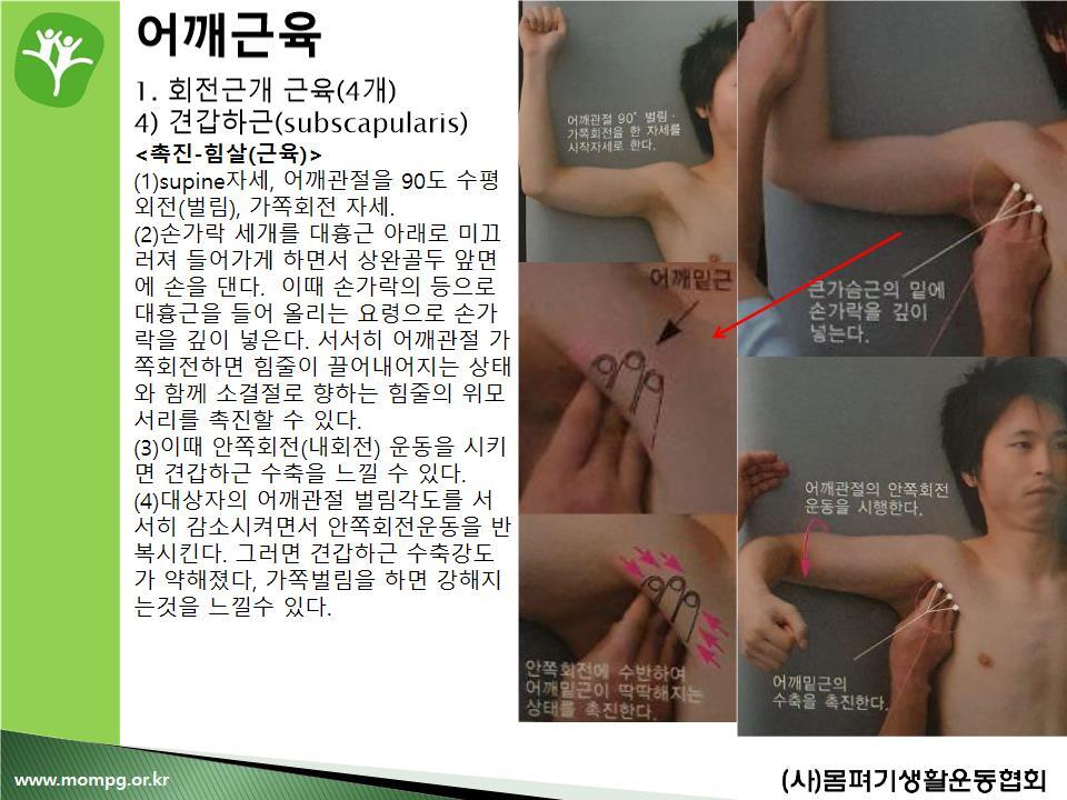 견갑하근 트리거포인트 만지는 아래 동작들 어렵지 않으며 수련시간에 어깨 안좋으신 수련생 한번씩 테스트 해보시고 동작의 어느 정도 개선되는지 점검해보세요.
