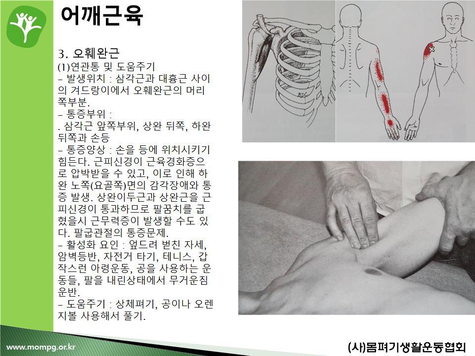 오훼완근의 통증유발점의 통증양상은 어깨부터 손등까지 있습니다. 부리돌기를 만지는 것은 어렵지 않으니 자신 몸의 부리돌기를 만져보세요. 잘 안만져지면 상완골두와 관계에서 생각하시고 팔을 내회전, 외회전시킬때 움직이는 부분이면 상완골두이고 움직이지 않는 부분의 뽀쪽한 끝부분이 오훼돌기입니다.