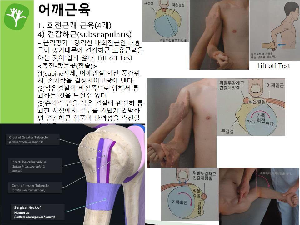 아래 슬라이는 오른쪽 위쪽의 사진중 견갑하근 근력을 테스트 하는 동작 Liff off test가 있으니 양손모두 테스트 해보시면 쉽게 알 수 있습니다. 특히 익상된 견갑골이 있는 쪽과 아닌쪽을 테스트 해보시면 좋겠죠. 이동작 자체가 견갑하근을 강화하는 동작이 되기도 합니다. 응용하시면 벽에 팔을 저렇게 되고 저속으로 저강도에서 약간씩 강도를 높여 10초 전후로 동작을 하는것도 좋겠죠.