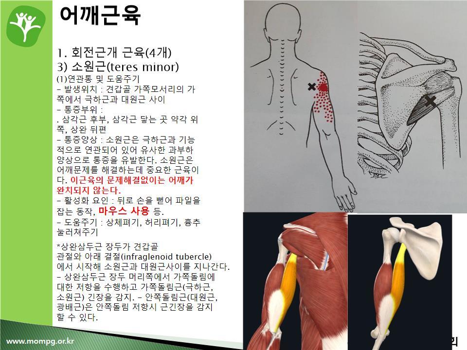 통증 유발점도 그 발생위치, 통증부위, 통증양상, 활성화요인 순서로 글자 하나하나를 보고 찾아 보세요. 소원근의 트리거포인트는 아래팔까지 통증이 내려가지 않습니다. 주로 위팔 뒤쪽에만 나타나는 통증의 경우 이지점을 살펴볼 필요가 있겠습니다.