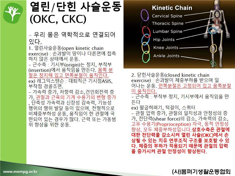 아래 슬라이드 설명 자세히 보시죠. 열린사슬운동, 단힌 사슬운동 영어로 OKC, CKC라고 합니다. 차이가 보이시나요. 주목할 점은 OKC는 기계수용기에 영향이 가고... 가동범위 향상을 위해...우리 동작의 팔돌리기는 열린 사슬운동입니다. 허리굽히기도 일종의 열린사슬운동. 반면에 무릎굽히기는 닫힌 사슬운동이겠죠. 이것은 고유수용감각을 자극해서 균형감각을 좋게하고 인대 등 결합조직의 동적 안정성(관절안정성)을 높힐 수 있습니다.