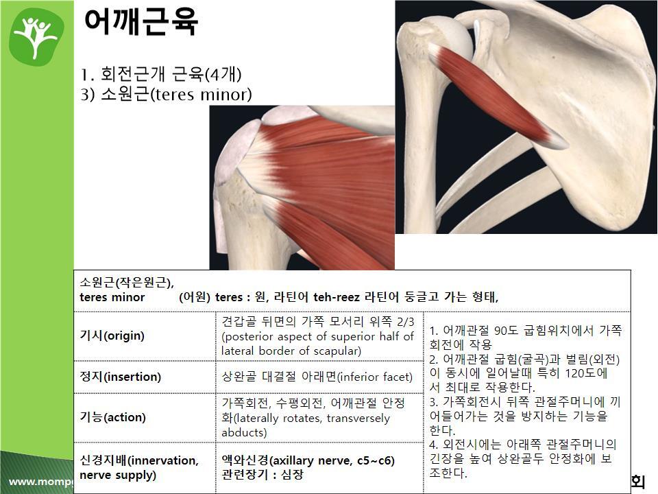 위에 그림을 보시면 소원근과 대원근 사이에 상완 삼두근 장두(노란색 근육)가 지나갑니다. 왼쪽 아래부분의 설명을 보시고 삼완삼두근 장두의 기능을 한번 살펴보시죠. 소원근과 대원근사이에 끼이어 있으면서 삼완삼두근 장두는 팔을 내회전시킬때(대원근과 광배근이 작용) 내회전근의 긴장을 감지하고 외회전(극하근, 소원근)근의 긴장을 감지한다고 되어 있습니다. 근육 공부를 하면서 이런 작용점들은 팔의 뒤쪽에 있는 근육을 기능을 다시한번 살펴보게 합니다.