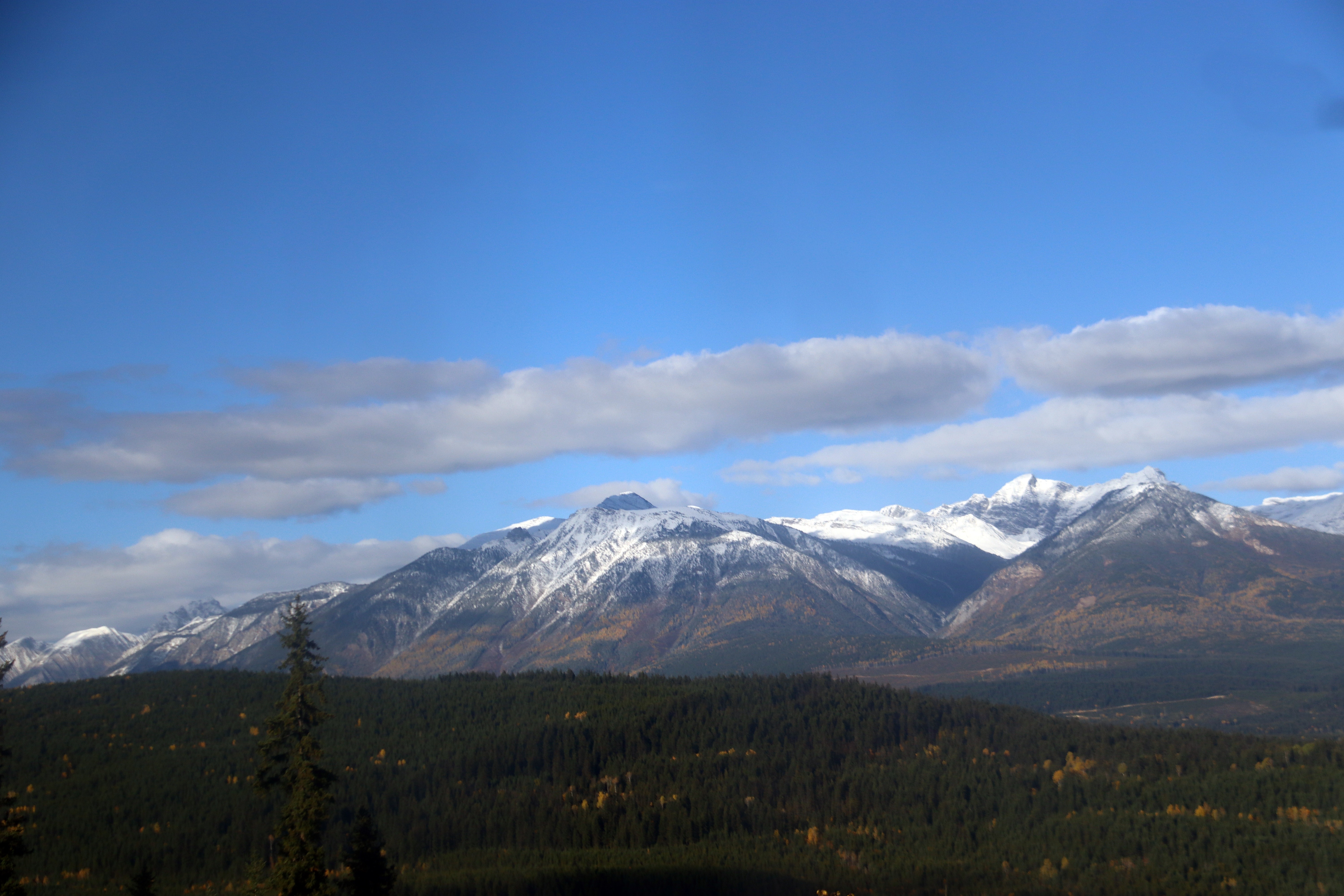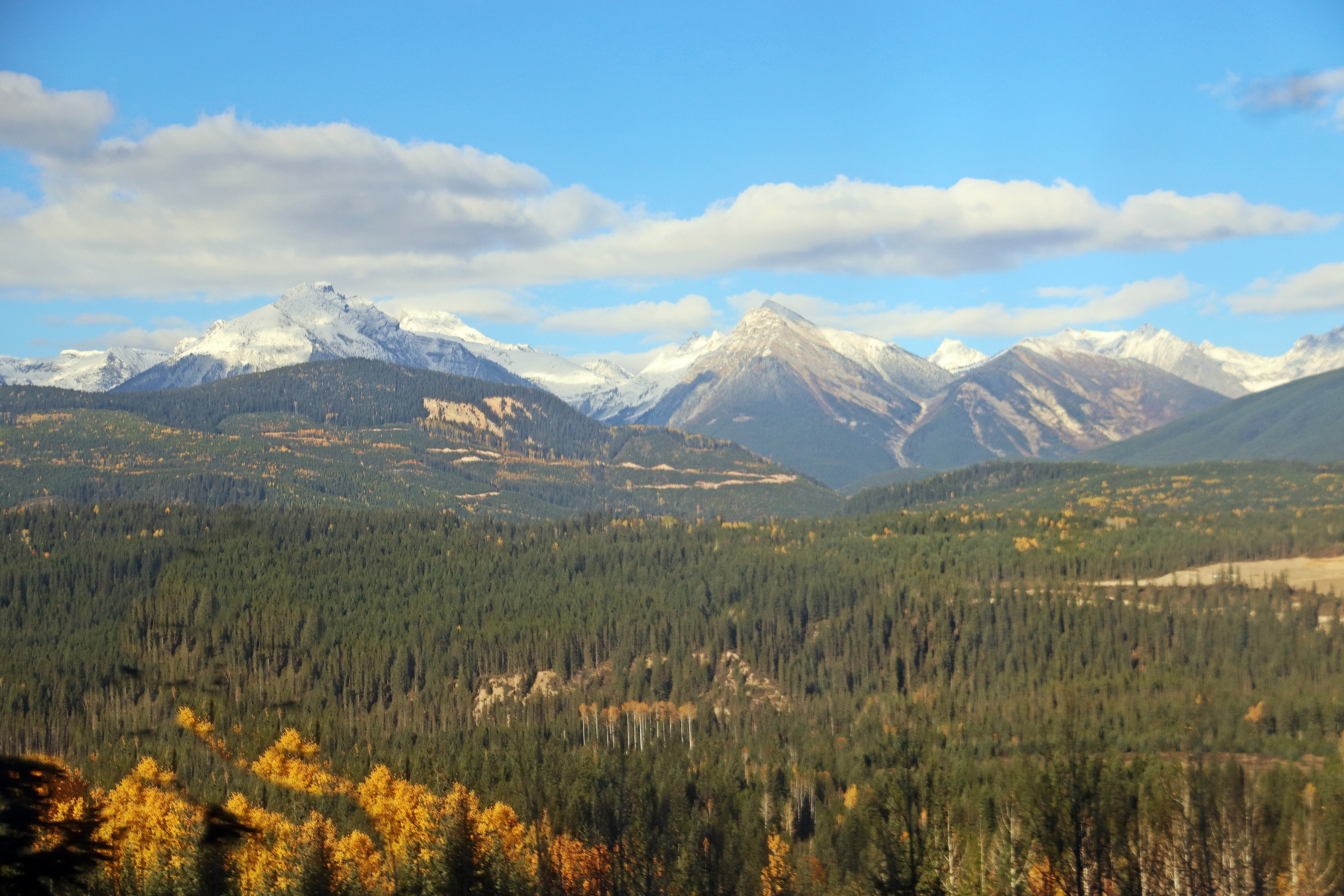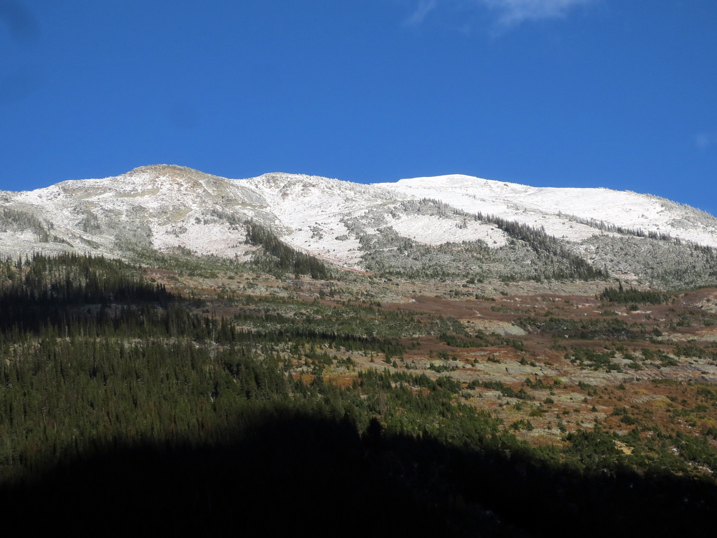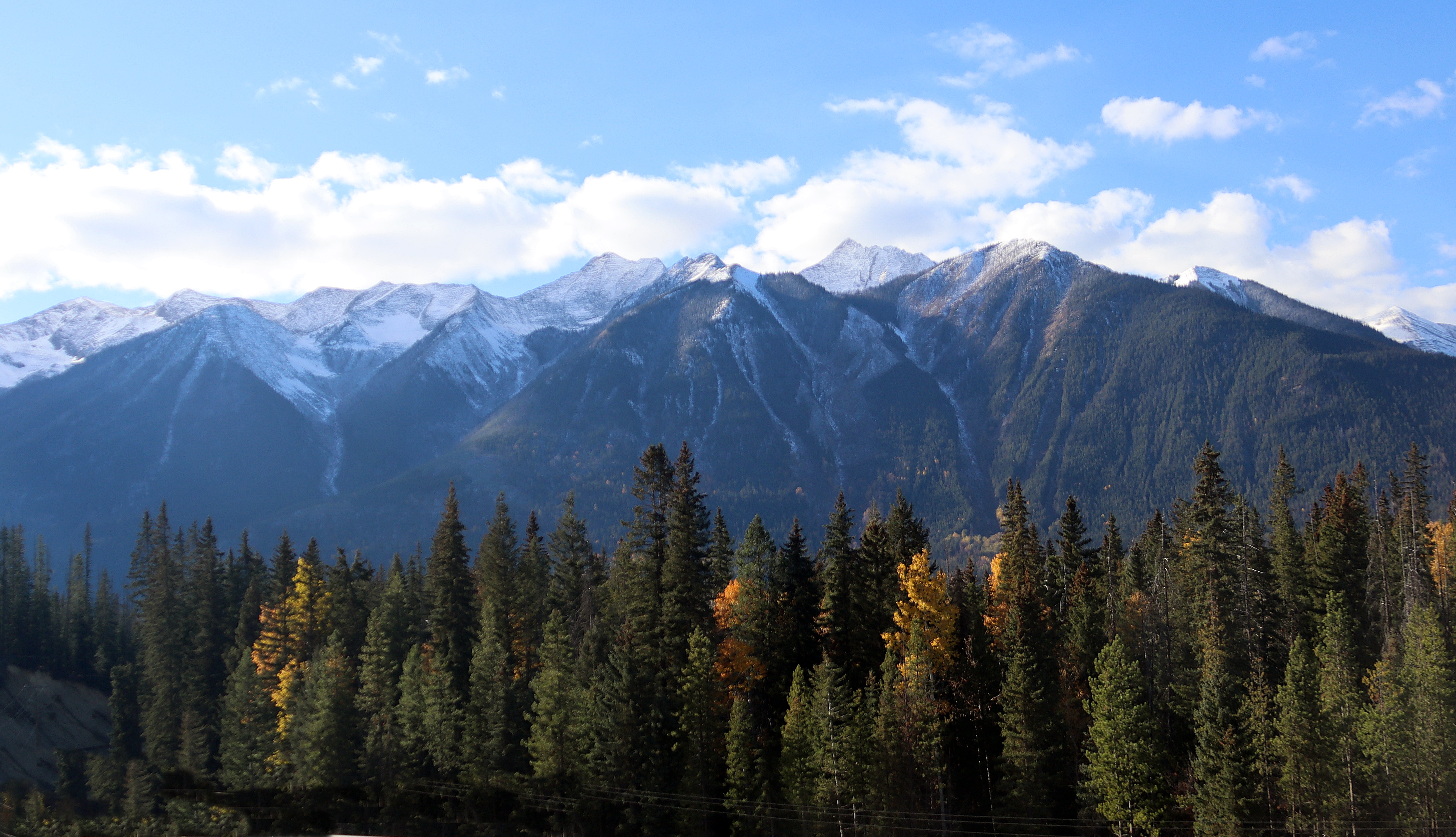 눈덮힌 산과 노란 자작나무의 조화가 가을과 겨울이 교차함을 느낀다