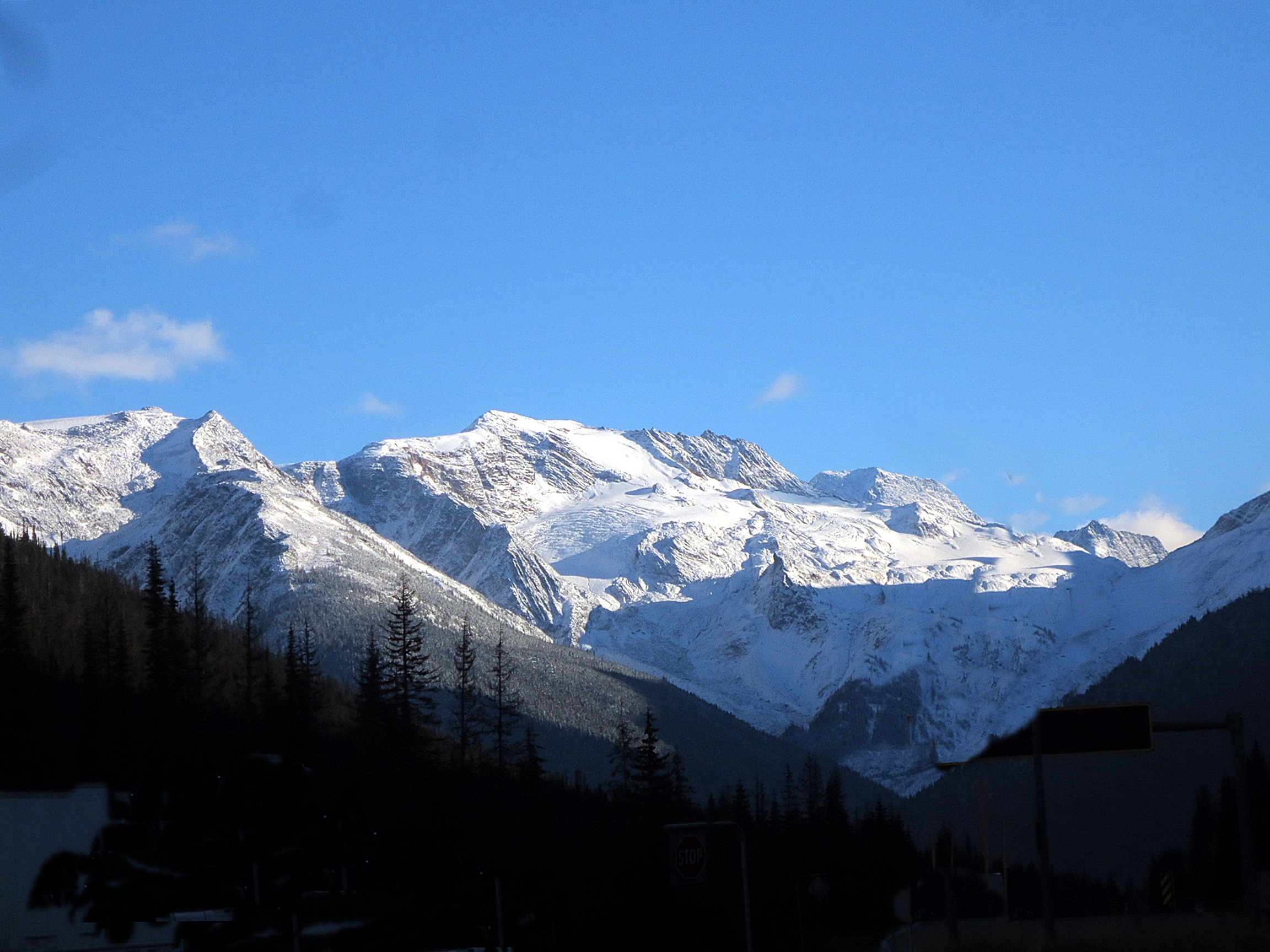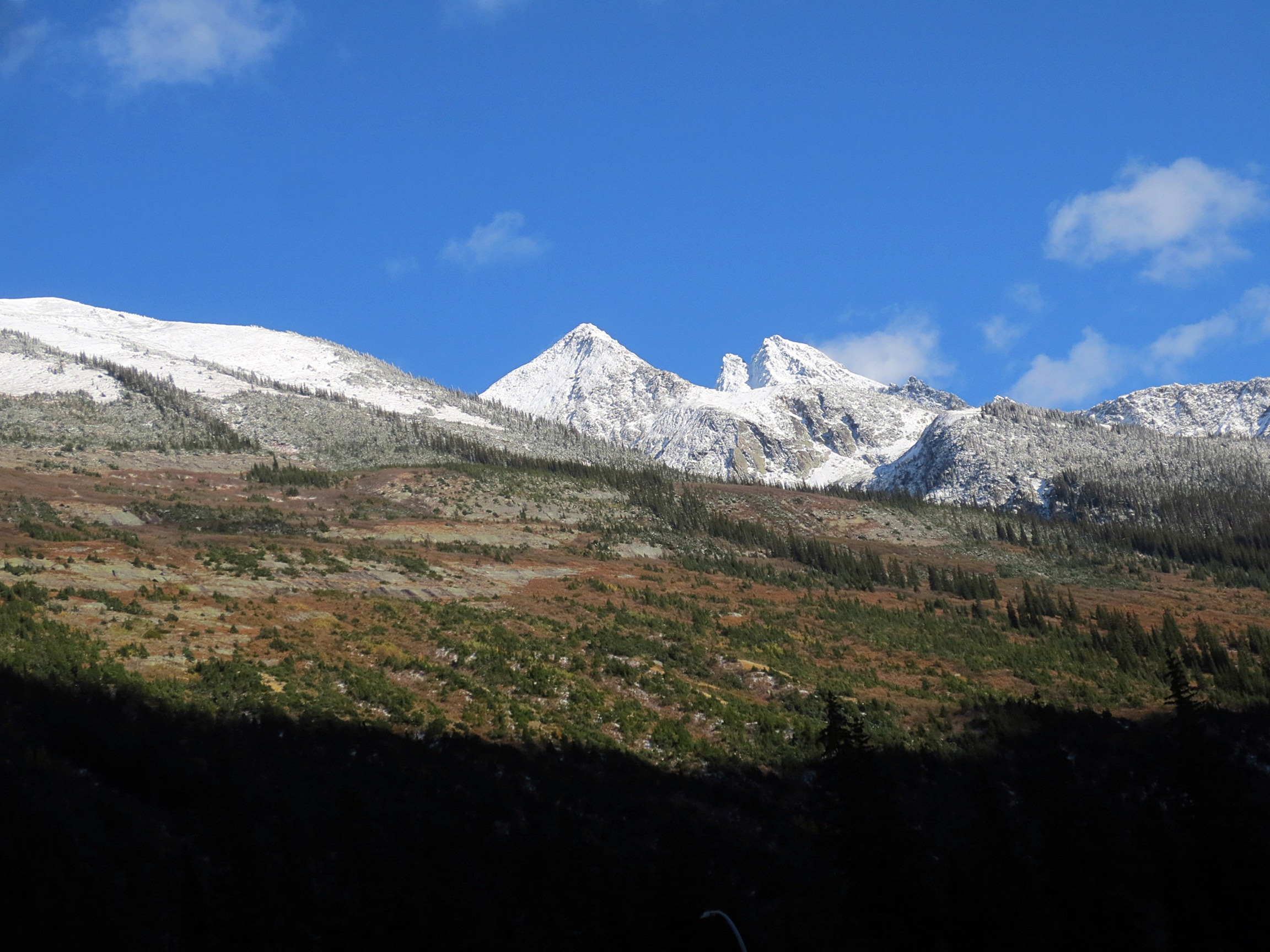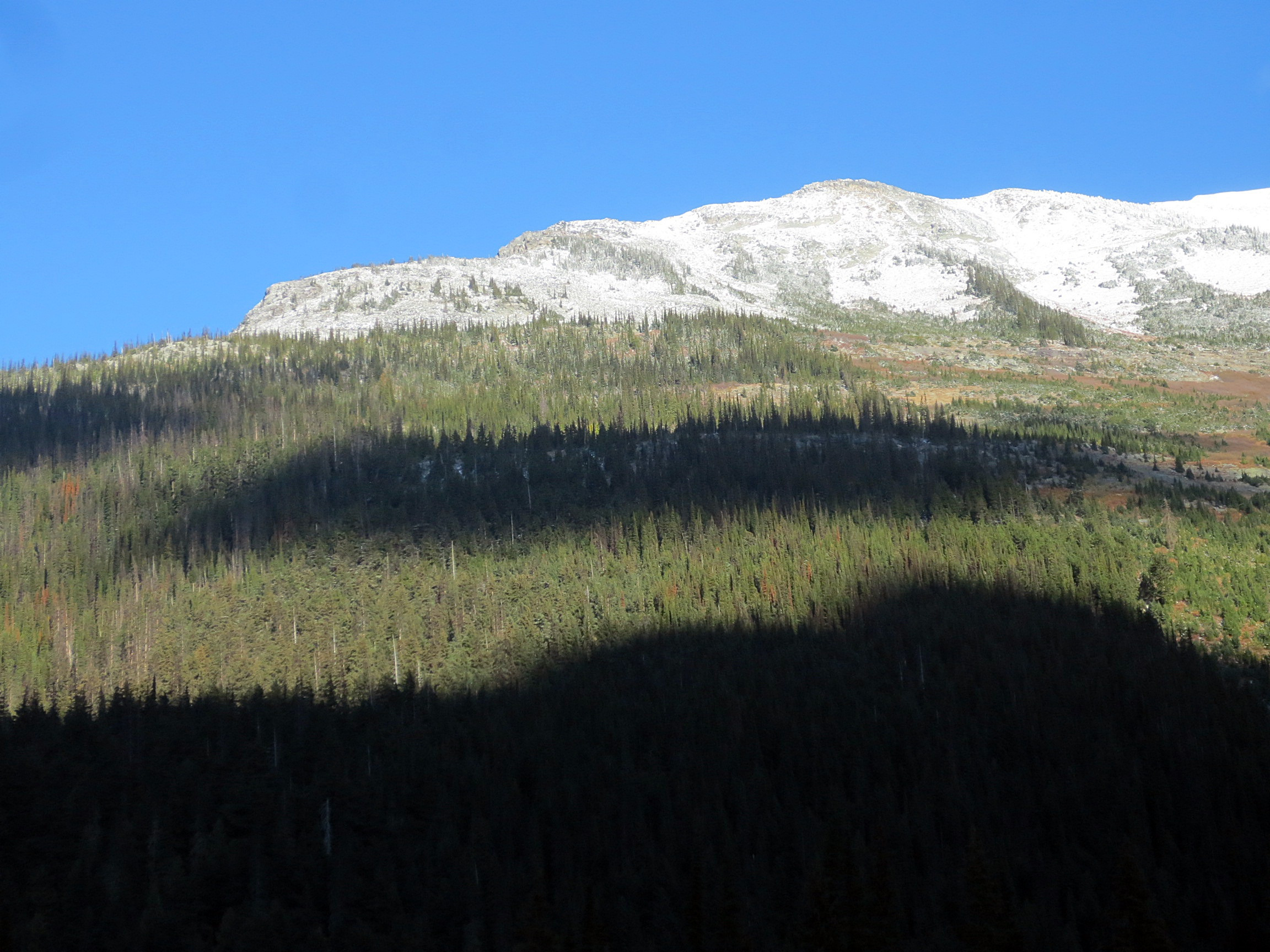 눈덮힌 산과 노란 자작나무의 조화가 가을과 겨울이 교차함을 느낀다