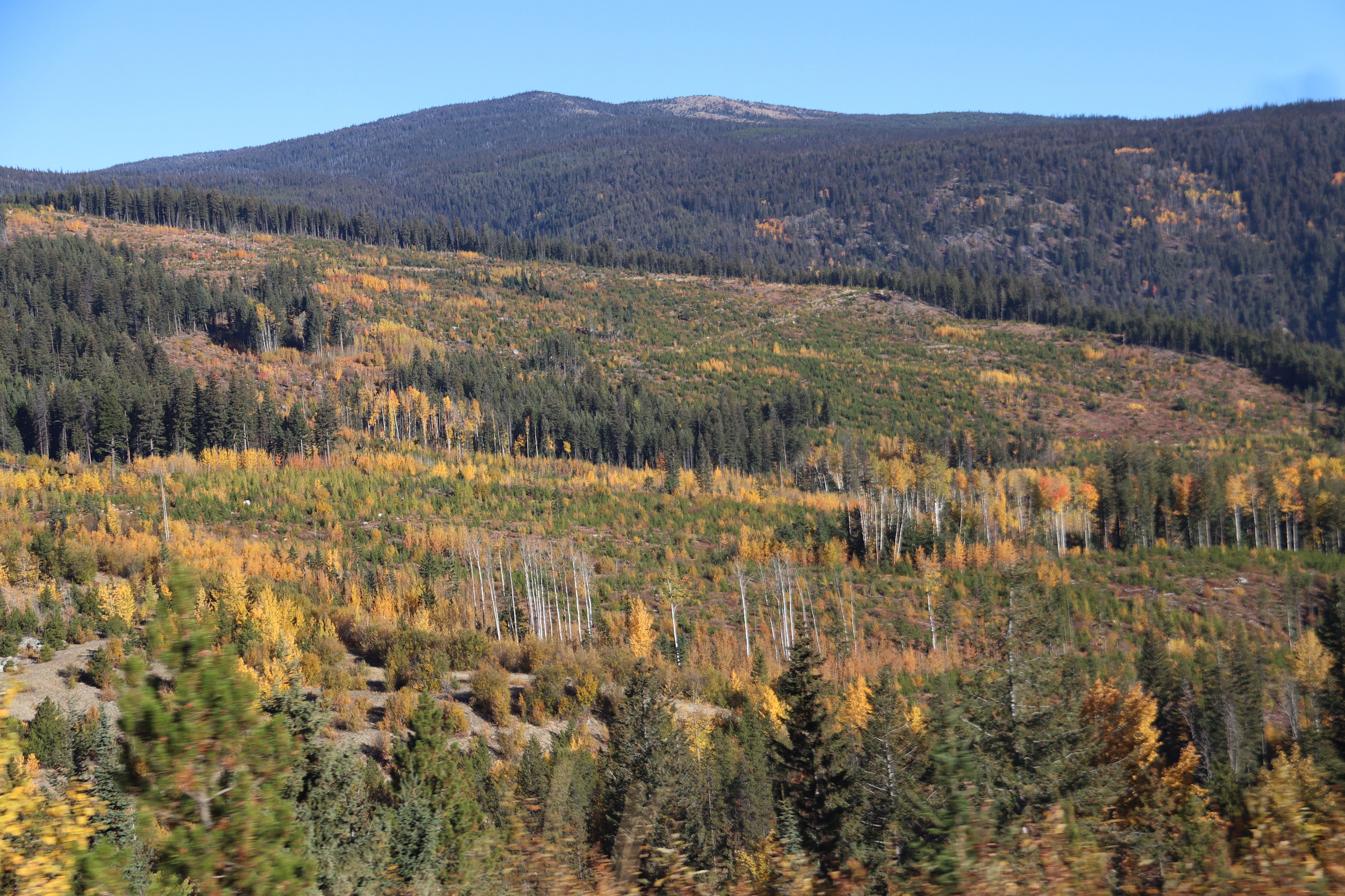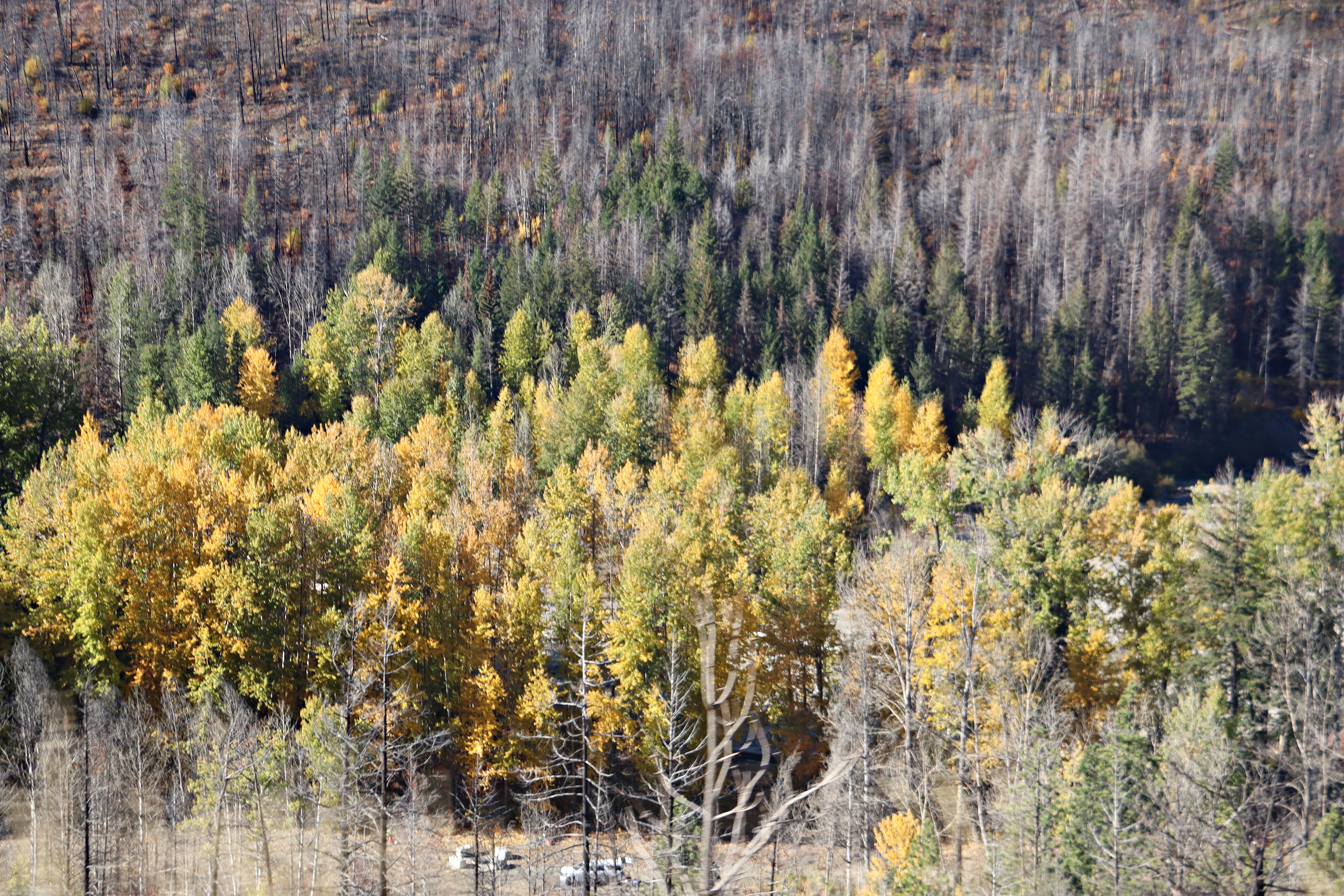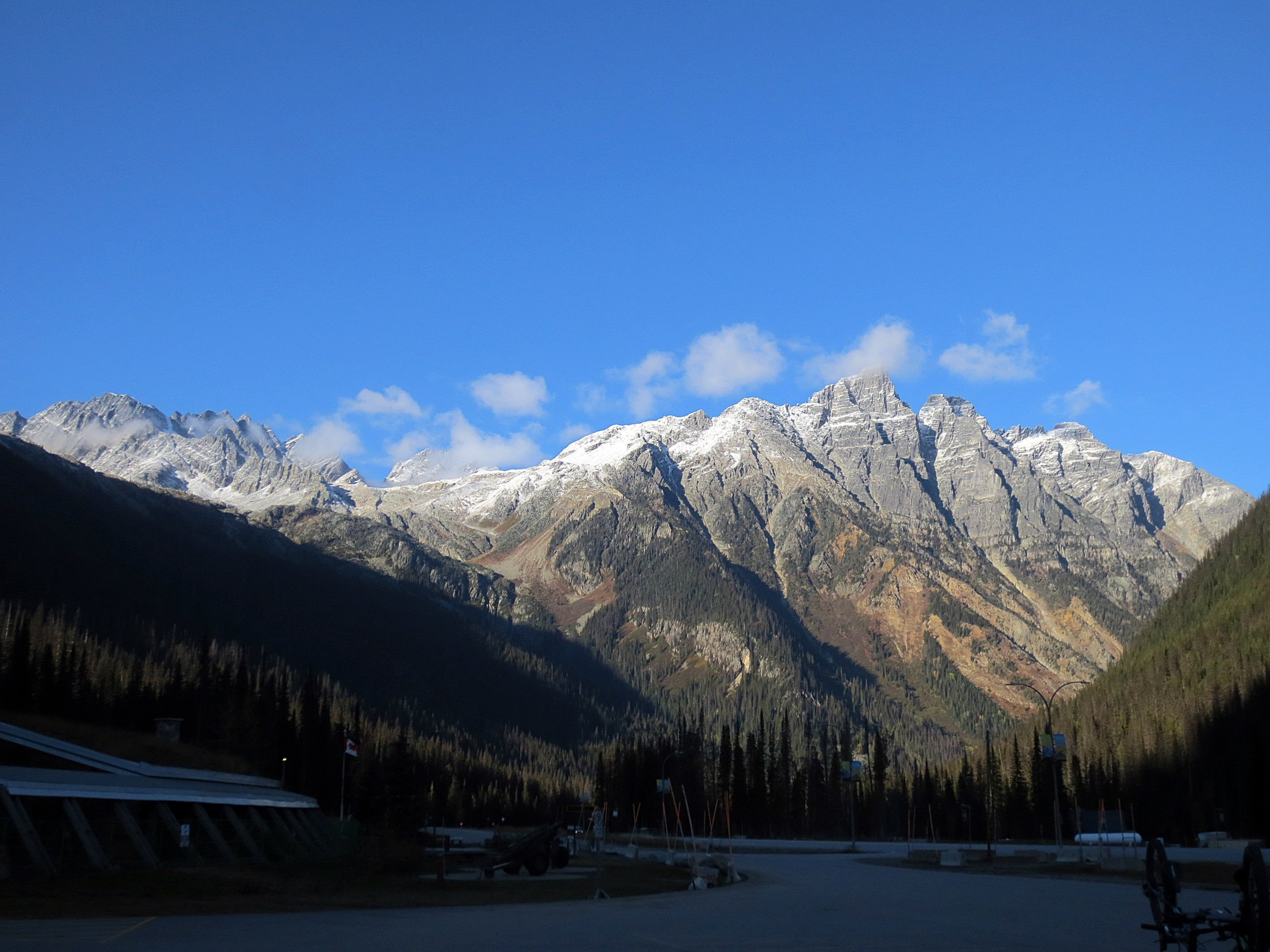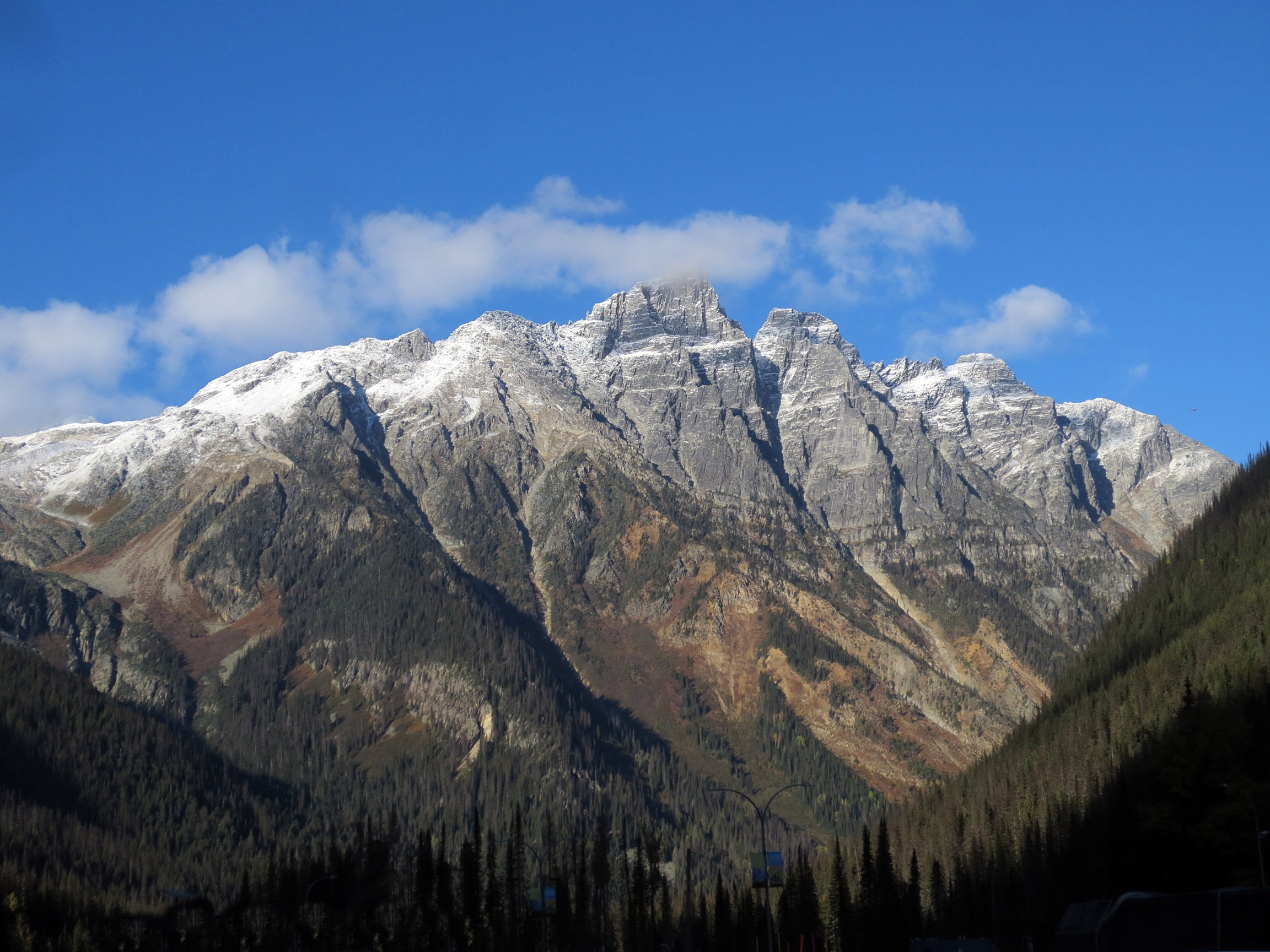 눈덮힌 산과 노란 자작나무의 조화가 가을과 겨울이 교차함을 느낀다