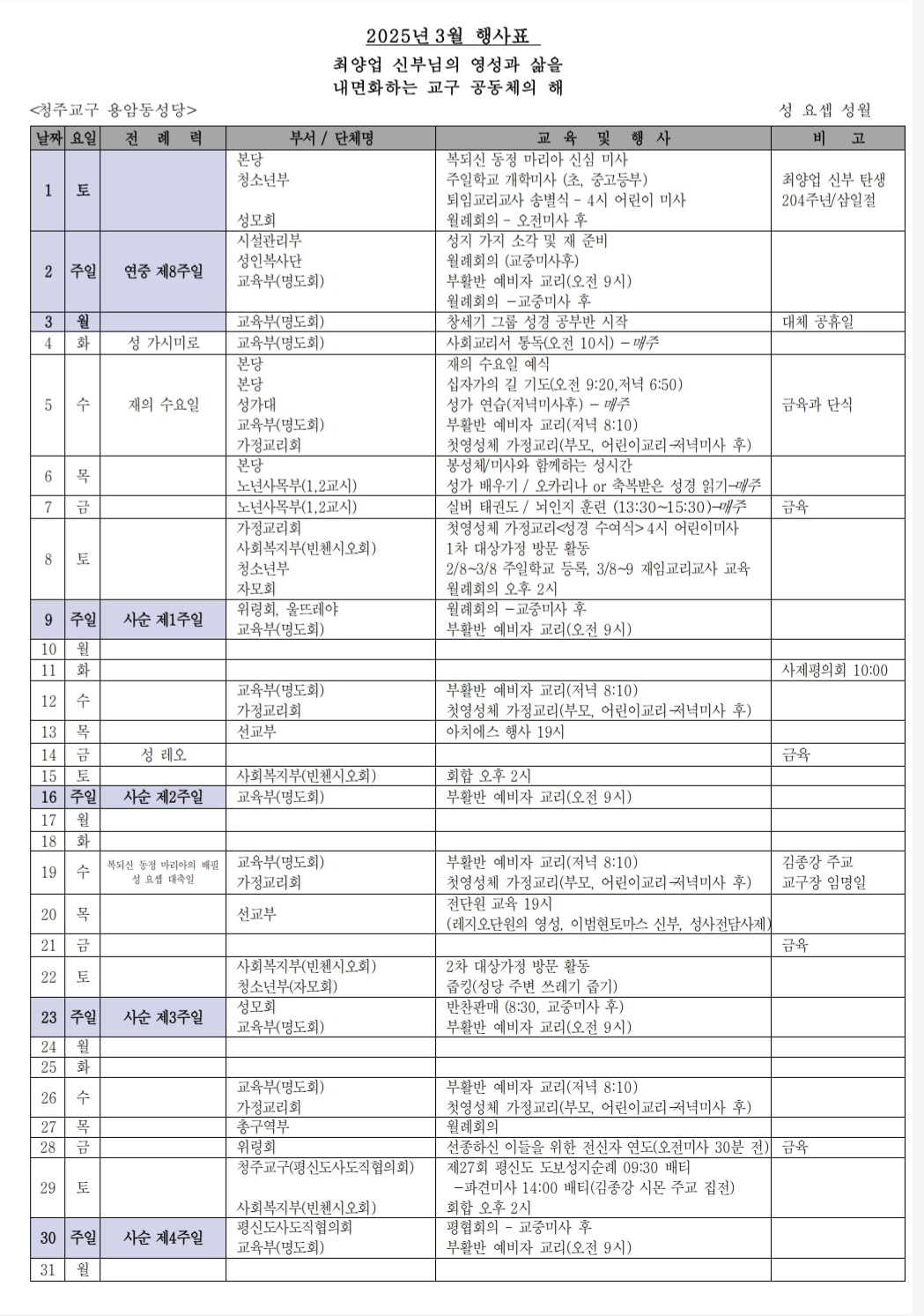 2025년 3월 행사표 작성자행사.홍보 기획부|작성시간25.03.01|조회수162 목록 댓글 0 글자크기 작게가 글자크기 크게가 2025년 3월 월중행사표.hwp104.50KB 첨부파일첨부된 파일이 2개 있습니다. png 파일 image.png 다운로드 hwp 파일 2025년 3월 월중행사표.hwp 다운로드 다음검색 현재 게시글 추가 기능 열기 북마크 공유하기 신고 센터로 신고 댓글 댓글 0 댓글쓰기 답글쓰기 댓글 리스트