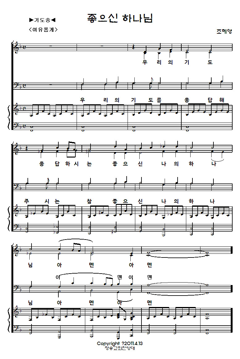 우리 청송교회찬양대는 테너가 1명뿐인 관계로 끝부분 아멘을 제외한 주멜로디를 남성파트 모두가 부르려고 합니다.