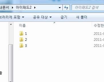 제가 만든 폴더를 예로 들자면... 아이패드2 폴더 내에 1,2,3 이라는 하위 폴더를 만들어서
