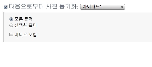 다음으로부터 사진 동기화 탭을 클릭한 다음.. 아이패드와 동기화할 PC의 폴더를 지정해 줍니다.