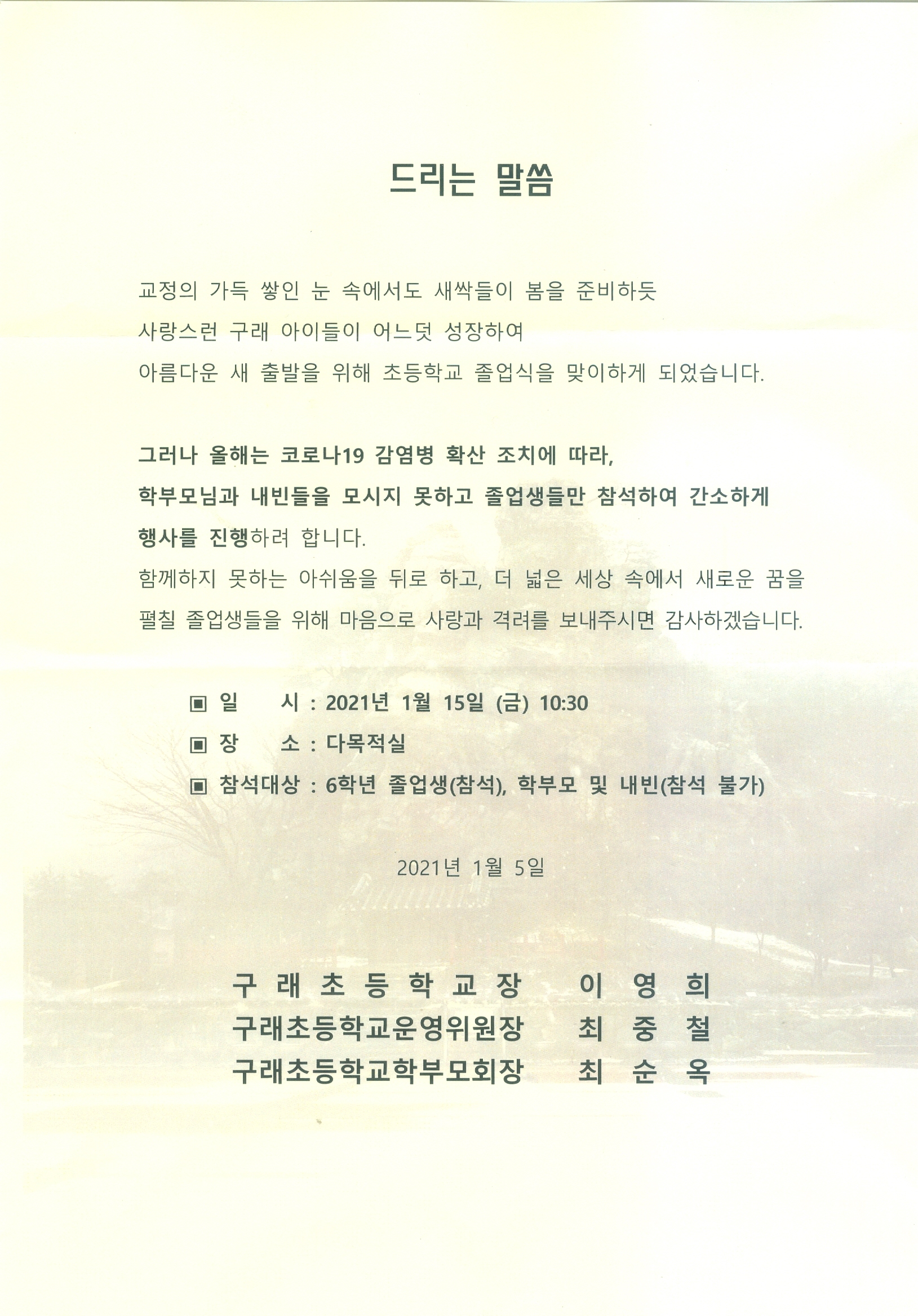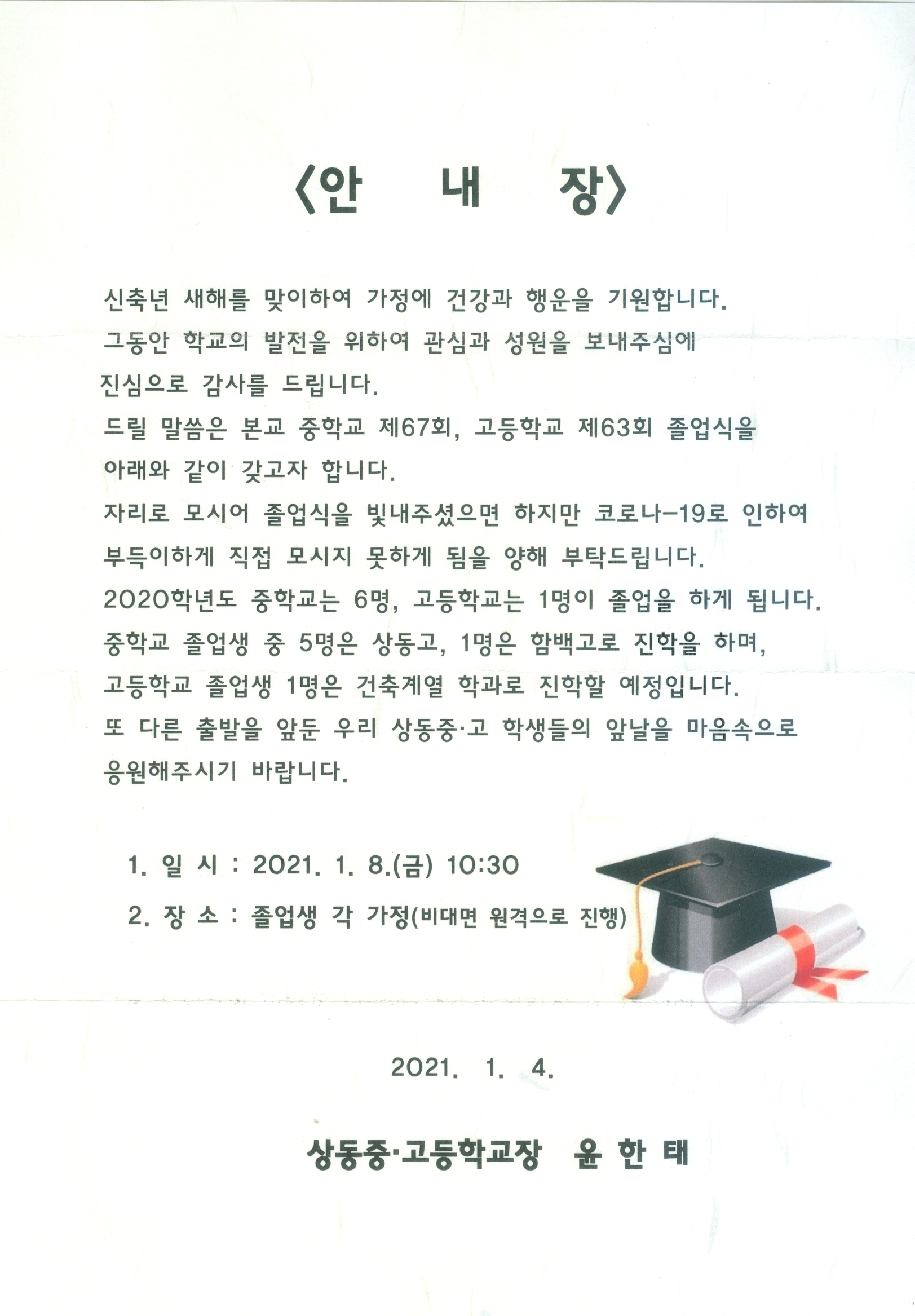 [스크랩] 2021년 모교졸업식 작성자장영근|작성시간21.01.09|조회수202 목록 댓글 0 글자크기 작게가 글자크기 크게가 2021년 구래초등학교및 상동중학교 제67회 ,고등학교 제63회 졸업식 안내장입니다 비대면으로 졸업생들만 참석하는 행사로 진행됩니다 다음검색 스크랩 원문 : 상동중고교 현재 게시글 추가 기능 열기 북마크 공유하기 신고 센터로 신고 댓글 댓글 0 댓글쓰기 답글쓰기 댓글 리스트