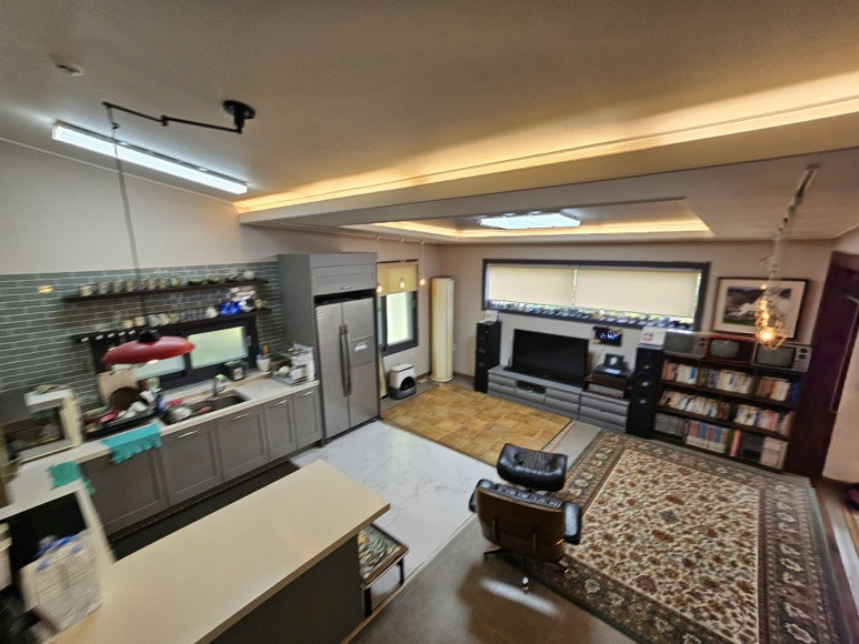 거실은 개방감 있게 설계되어 있으며, 거실 앞쪽으로 증축된 공간이 있어 생활공간 활용도가 매우 뛰어납니다.