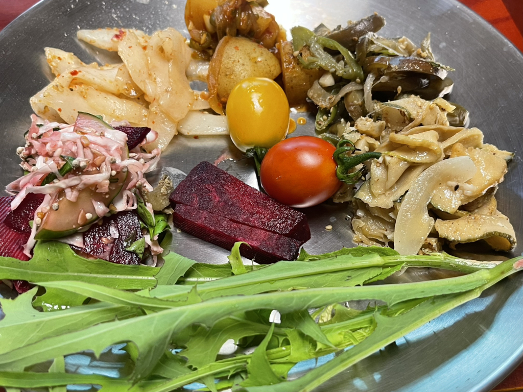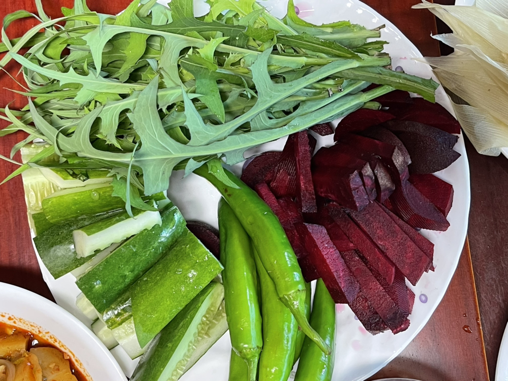 고들빼기, 오이, 풋고추, 비트, 여주, 찐 옥수수
