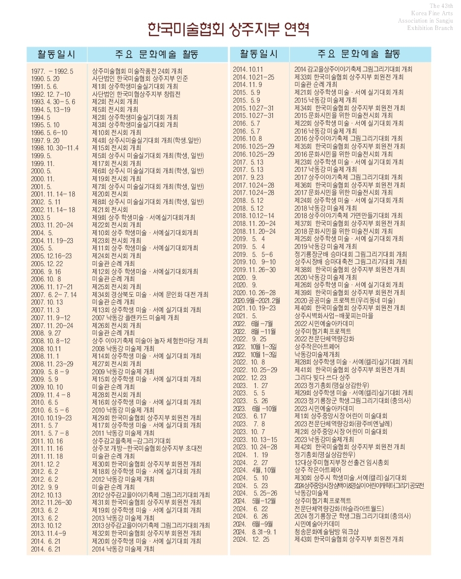 2025 한국미술협회 상주지부 연혁 작성자사무국장 박혜주|작성시간25.01.17|조회수35 목록 댓글 0 글자크기 작게가 글자크기 크게가 다음검색 현재 게시글 추가 기능 열기 북마크 공유하기 신고 센터로 신고 댓글 댓글 0 댓글쓰기 답글쓰기 댓글 리스트