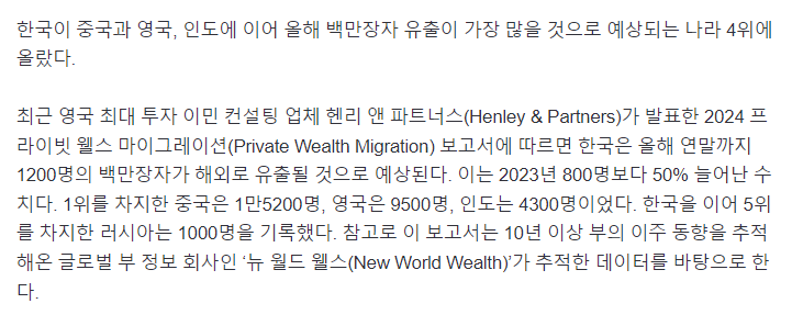 백만장자들 돈 싸 들고 도망간다"…英보고서가 평가한 한국은 작성자총포사2_01086157667|작성시간24.07.22|조회수7 목록 댓글 0 글자크기 작게가 글자크기 크게가 https://n.news.naver.com/article/011/0004369932"백만장자들 돈 싸 들고 도망간다"…英보고서가 평가한 한국은한국이 중국과 영국, 인도에 이어 올해 백만장자 유출이 가장 많을 것으로 예상되는 나라 4위에 올랐다. 최근 영국 최대 투자 이민 컨설팅 업체 헨리 앤 파트너스(Henley & Partners)가 발표한 2024 프n.news.naver.com 다음검색 현재 게시글 추가 기능 열기 북마크 공유하기 신고 센터로 신고 댓글 댓글 0 댓글쓰기 답글쓰기 댓글 리스트