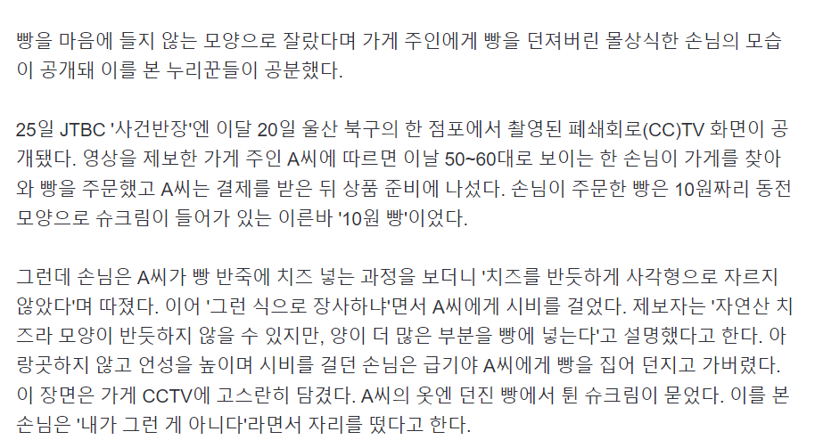 "반듯하게 안 잘라?" 사장에 '10원빵' 집어던진 진상 손님 작성자총포사2_01086157667|작성시간24.07.26|조회수6 목록 댓글 0 글자크기 작게가 글자크기 크게가 https://n.news.naver.com/article/469/0000814404 다음검색 현재 게시글 추가 기능 열기 북마크 공유하기 신고 센터로 신고 댓글 댓글 0 댓글쓰기 답글쓰기 댓글 리스트