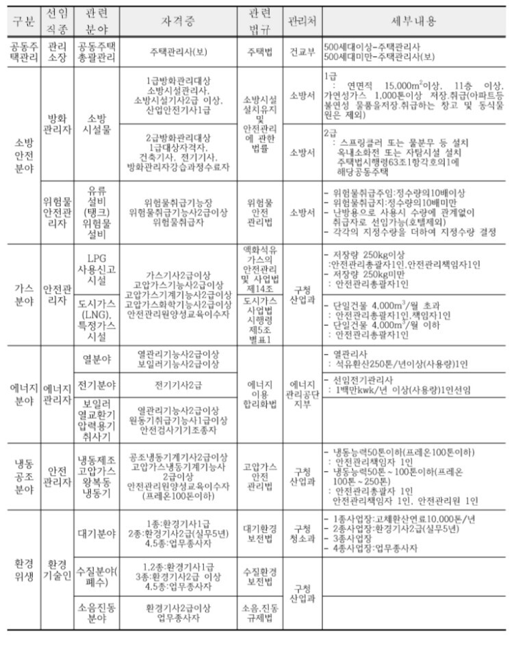 일반적으로 일정규모의 건축물 및 공동주택 등에는 기본적으로 주택관리사(보), 전기안전관리사, 소방안전관리자 등
