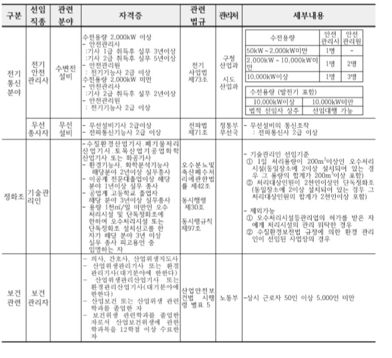 (전기는 대체할 수 있는 양성교육이 없어 무조건 전기산업기사이상 자격증 없으면 선임불가)