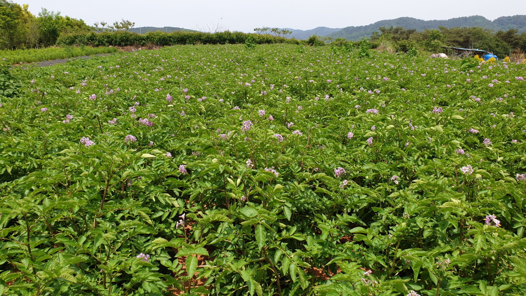 오르는 산길 옆의 감자밭에 감자 꽃이 피어 있었다. 어릴 때 감자에 대한 추억이 스쳐 지나갔다. 감자 꽃이 자색이면 감자의 색깔도 자색이고, 감자의 꽃이 흰색이면 감자도 흰색이다. 꽃만 보아도 감자의 뿌리 색깔을 알 수 있다.