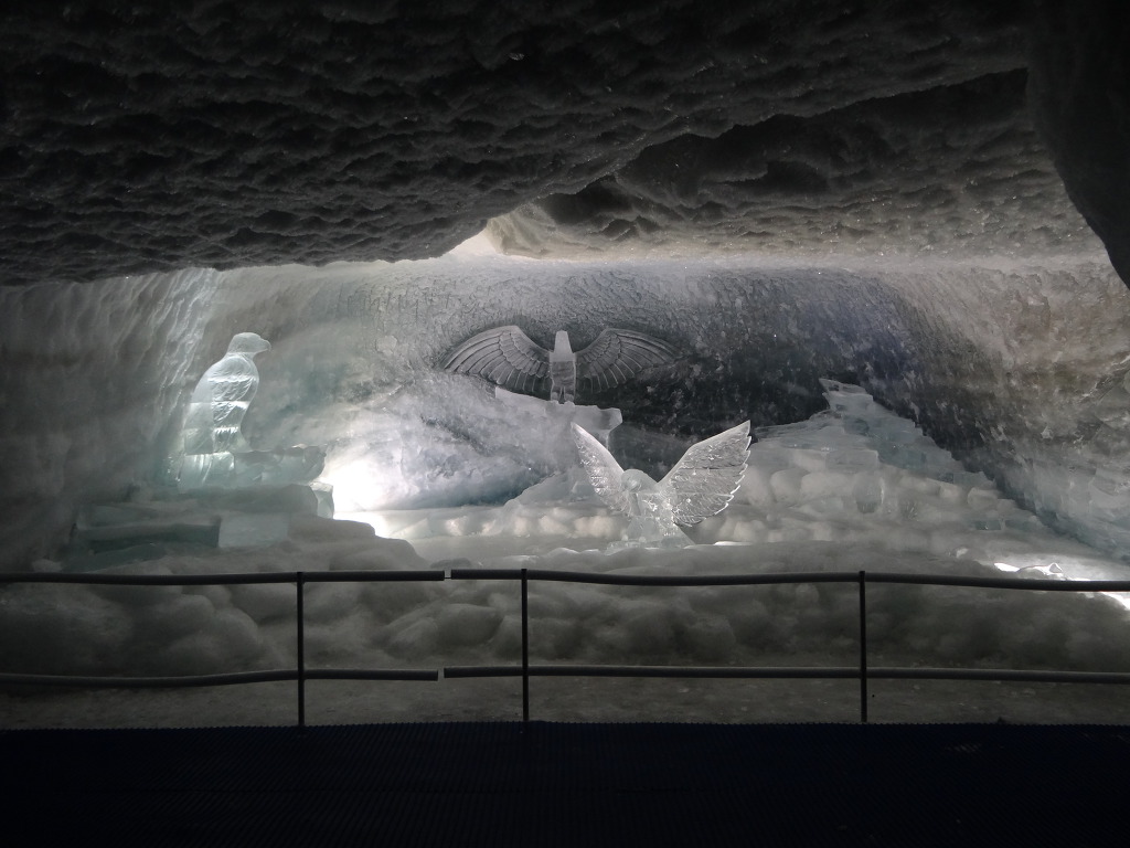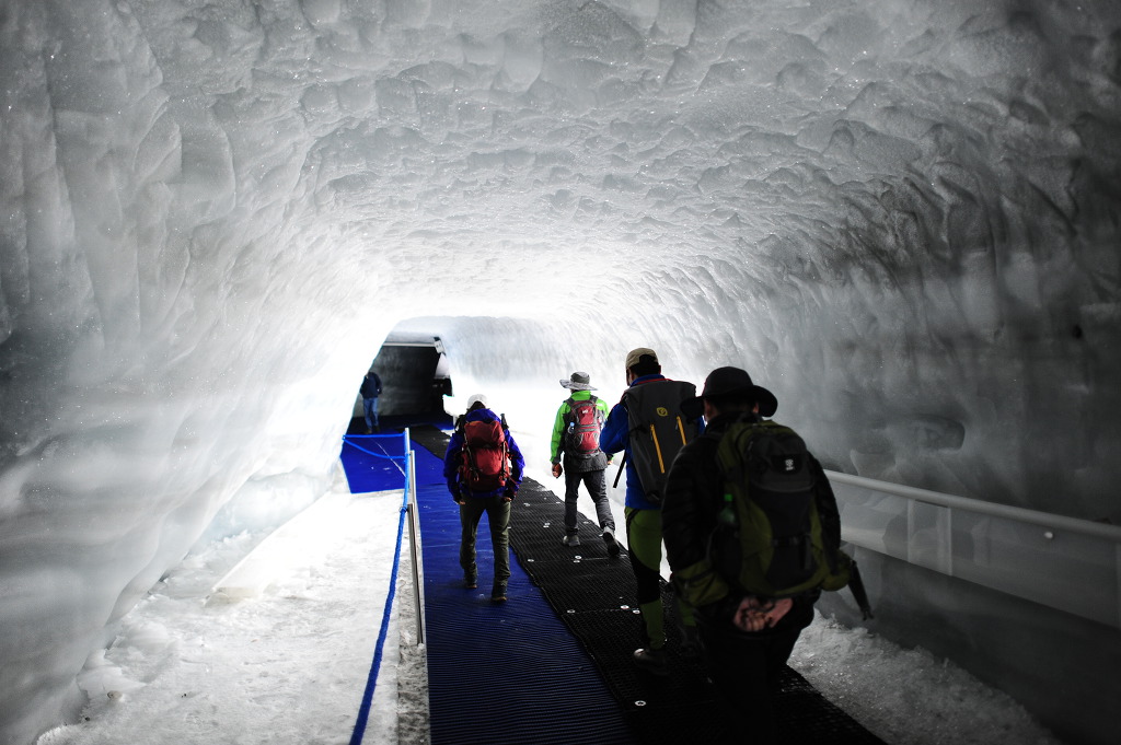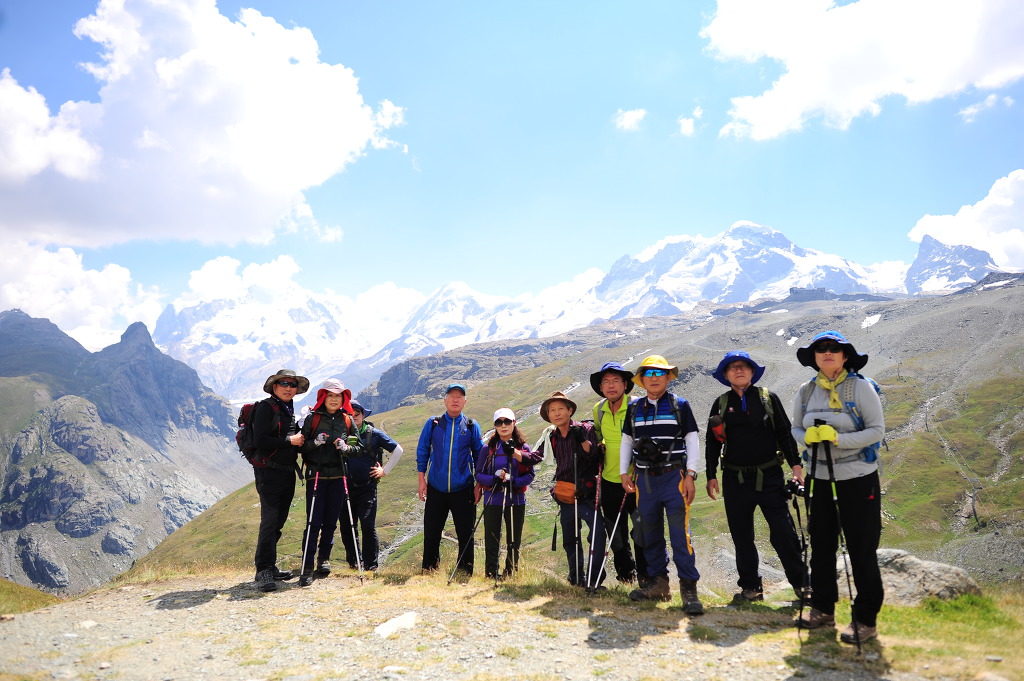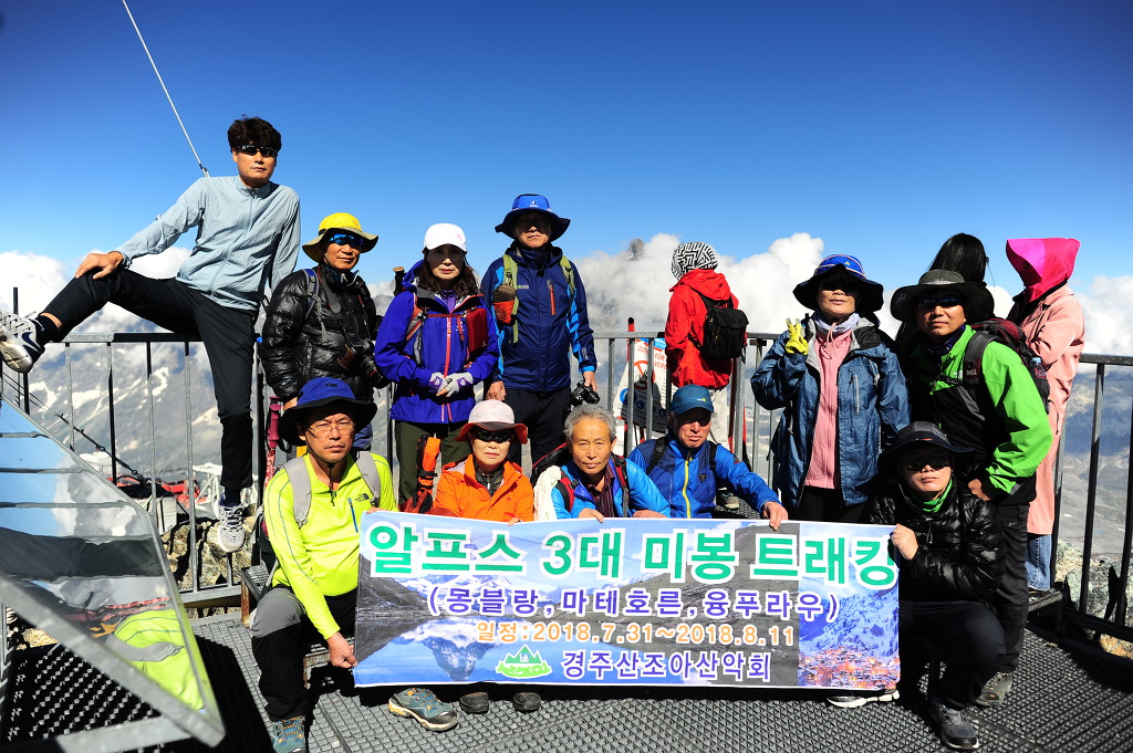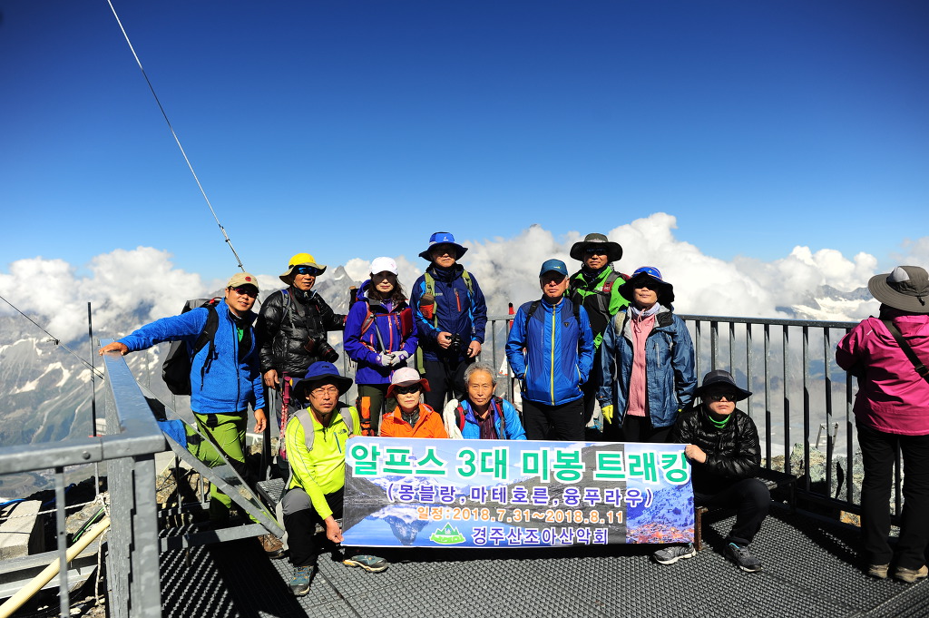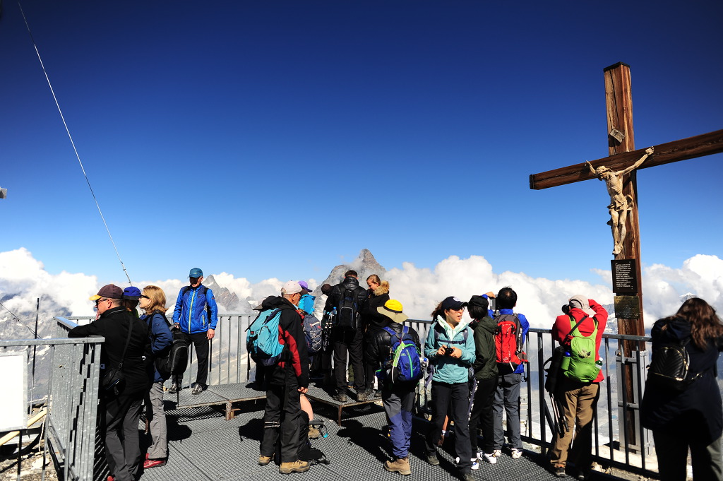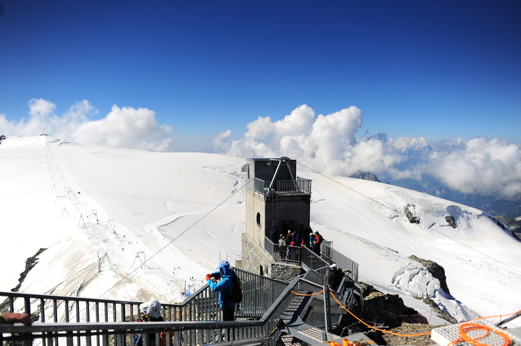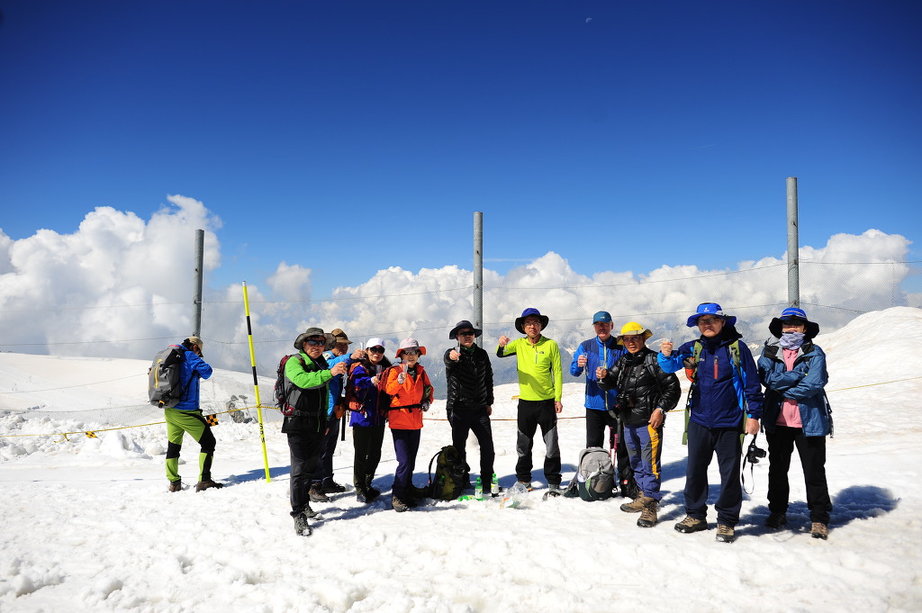 세계 3대 미봉이면서 알프스 3대 미봉이기도 한 마터호른(4,478m)과 만년설의 스키장 그리고 브라이트호른과 주변의 고봉들을 바라보면서 감탄사를 연발하면서 조망을 즐긴 후 단체사진을 촬영하고 얼음동굴을 관람한 후 만년설의 스키장 위에서 와인으로 축배를 든다.