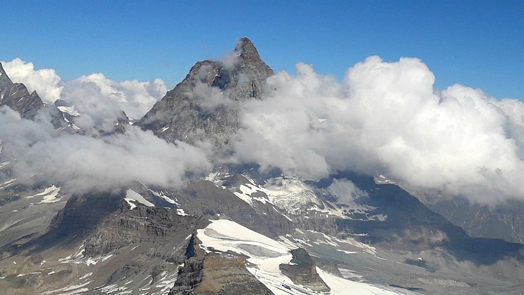 좌측으로는 맑게 갠 파란 하늘 아래 삼각굴뚝 모양의 피라미드에서 피어난 연기가 바람에 날리듯 마터호른을 휘감고 있으며, 날카로운 바위 절벽은 주변에 거느리는 위성 봉우리도 없이 우아하면서도 고고한 자태를 뽐내고 있다.