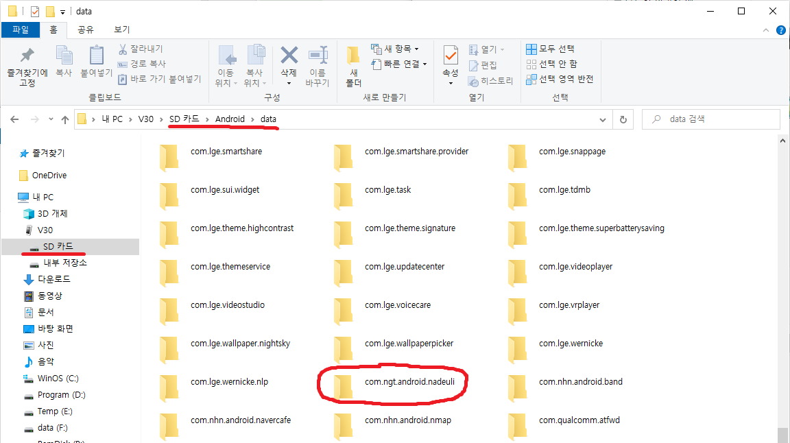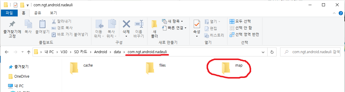 즉 "지도 저장 위치 설정"이 ".../com.ngt.android.nadeuli/map"인 경우 PC에서 usb를 연결하여 본 경우입니다.