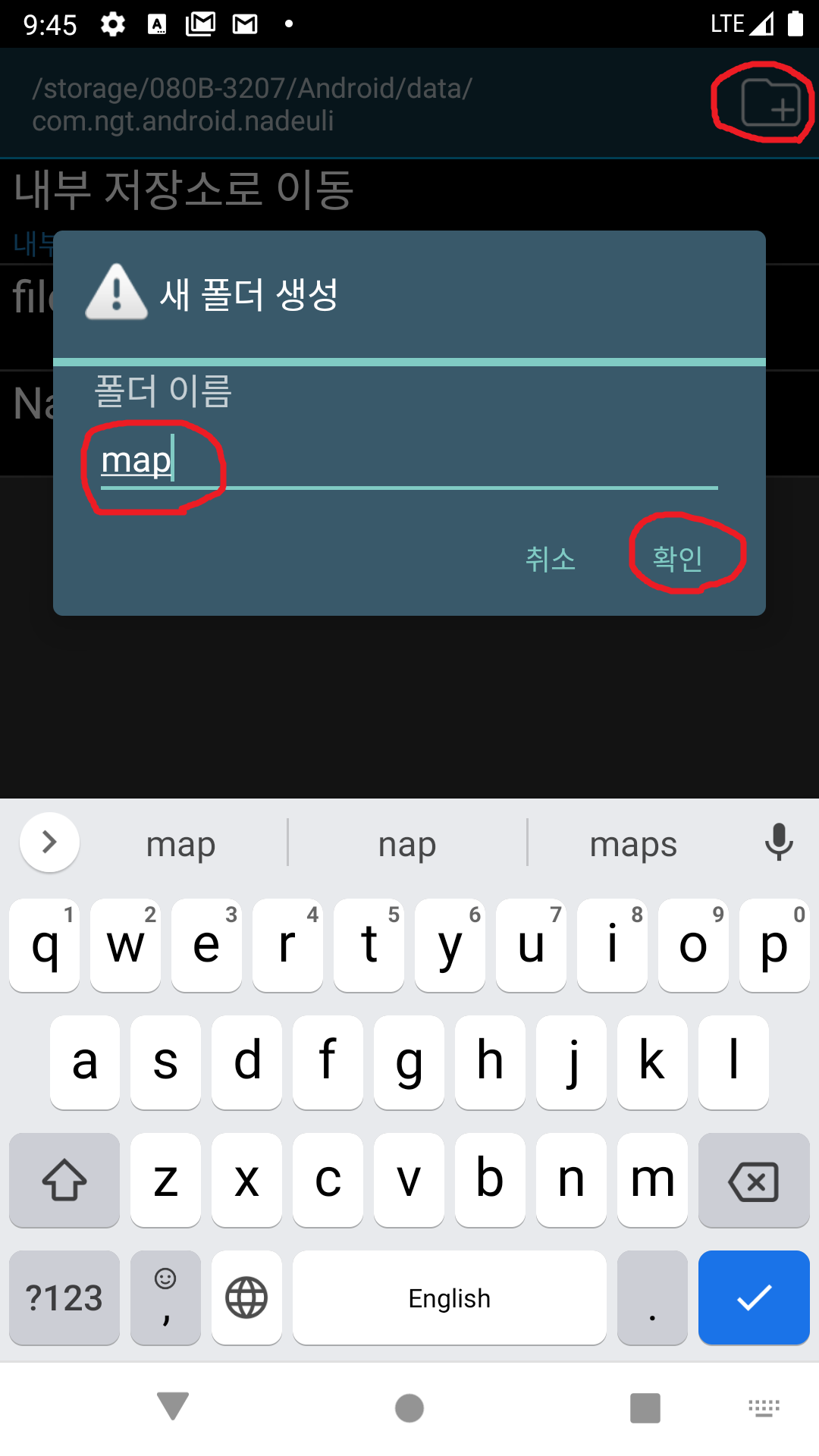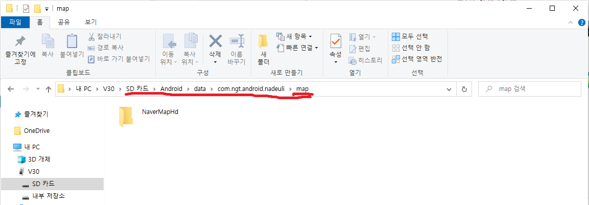 만약 SD카드의 다른 폴더에 지도를 저장하고자 하면, (아래 예에서는 "map"폴더)