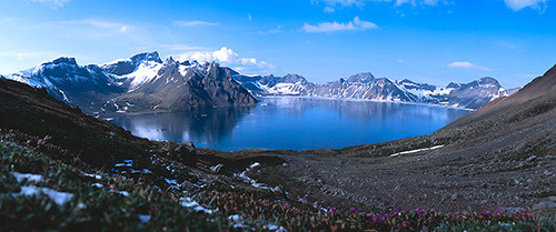 백두산 중앙부는 넓고 파란 호수 주변에 회백색 산봉우리들이 둥그렇게 둘러 있어 아름다운 경관을 이룬다.