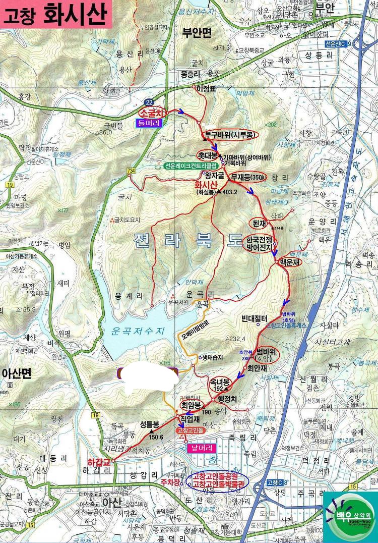 소굴치 `투구바위 ~촛대봉 ~무재등 `화시산 ~운곡습지 홍보관 ~운곡서원 ~탐방안내소