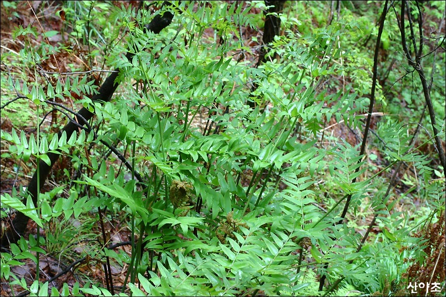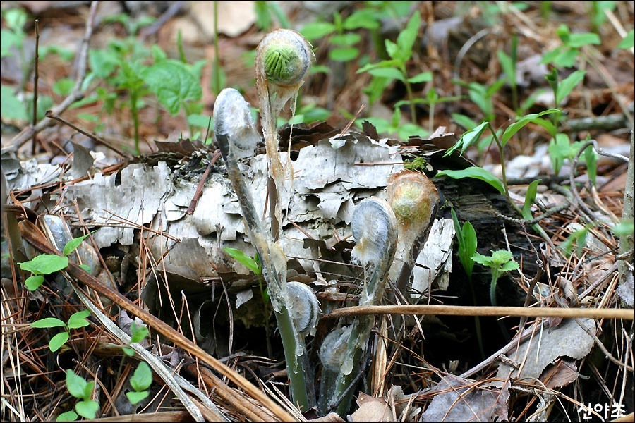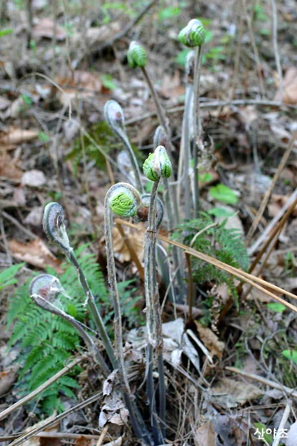산지의 숲 속에서 자란다. 땅속줄기는 짧고 굵으며 덩이 모양이고 많은 잎이 뭉쳐난다. 높이는 60∼100cm이다. 잎은 영양엽과 포자엽으로 구별되고 어릴 때는 붉은빛이 도는 갈색의 솜털이 빽빽이 있으나 점차 없어진다.