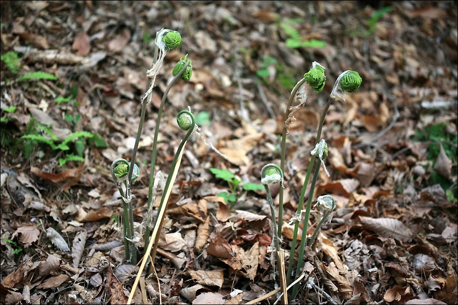 어린 잎은 아기의 주먹처럼 둥글게 감겨 있고 많은 털로 덮여 있으며 자라나면서 서서히 풀려 길이는 30cm가 넘는 큰 잎으로 변한다.