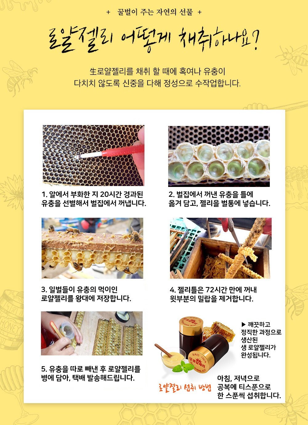 로얄젤리는 피로회복, 피부미용, 성장촉진 등 여러 효능이 있습니다.