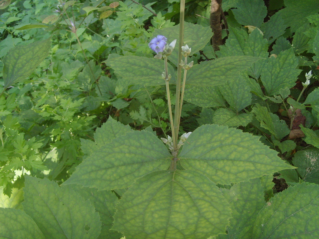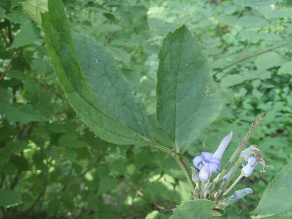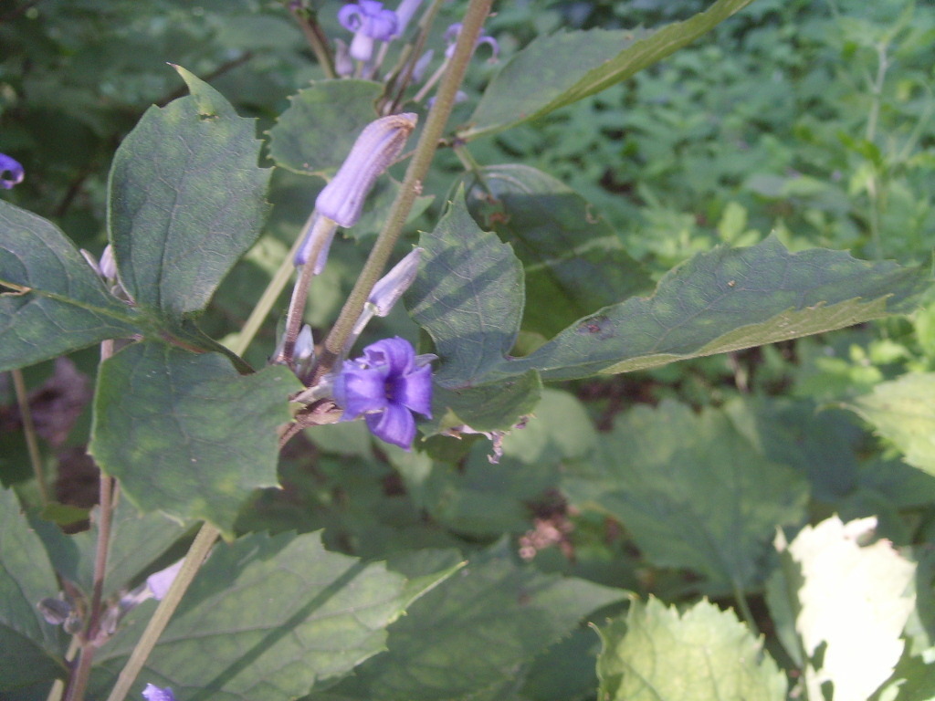 꽃은 2가화로서 8∼9월에 피고 남청색이며 가지 윗부분의 잎겨드랑이에 모여 달리기 때문에 거의 두상(頭狀)으로 보인다. 꽃받침잎은 4개로서 밑부분만이 합쳐져서 통 모양으로 되고 윗부분은 넓게 수평으로 퍼지며 뒤로 말리지 않고 하늘색이다. 꽃잎도 수평으로 퍼지고 뒤로 말리지 않는다.