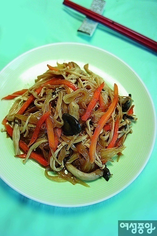 당면보다 얇은 팽이버섯의 쫄깃한 식감 때문에 당면을 넣어 만든 잡채보다 더 맛있네요.