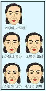 또 인중의 양 옆의 남성들 콧수염이나는곳을 식록(食祿)이라고 부르며 이곳은 집으로 말하면 주방에 해당되는 곳으로 식록이 넓고 탄력이 있으면 생계에 여유가 있고 재산을 이룬다고 합니다. 식록이 좁은 사람은 주방이 좁고 생활도 어렵다고 판단하며, 또 이곳에 흠이 있으면 손님이 밥그릇을 좀먹고 있는 격으로 손님에게 시달리는 관상입니다. 대개 식록이 넉넉한 사람은 인중도 길고 수명과 재물이 넉넉합니다. 따라서 인중은 길면 길수록 좋다고 합니다. ◈ 인중과 운명 관상법에는 인중의 모양을 보고 아들,딸중에 어느쪽을 많이 낳을것인가를 대충 판단합니다. 좌측 그림의 1번,3번처럼 인중 하부끝이 연필끝처럼 뾰쪽하게 되어 있거나 상부보다 넓은 인중의 여성은 아들을 많이낳고, 2번같이 인중하부가 둥근형이면 딸을 많이 낳으며 인중의 상하부가 균등하면 아들 딸의 수가 반반이라 가장 자식복이 많은 좋은 관상입니다. 또 인중의 상부는 넓고 하부가 좁은 사람이나 인중 전체가 아주 가늘은 사람, 또 인중의 가운데만 넓은 사람은 남녀를 불문하고 나이가 많아질수록 생활이 어려워지며 매사 중도에 무너지고 마는 사람들 입니다. ◈ 인중으로 판단하는 운세 여성의 인중은 자궁으로 보는데 인중이 삐뚤어진 경우 자궁이 전굴(前窟) 또는 후굴(後屈)이 되어있어 나이가 들면서 허리가 아플 경우가 많습니다. 인중에 점이 있으면 자궁에 흠이 있는 격으로 자궁에 질병이 있는 경우가 많습니다. 위의 그림에서 코 바로 밑에 흠이 있으면 단명으로 판단하는데 옛날에는 난산의 위험이 있다고 생각해서 나온 발상이 아닌가 합니다. 인중의 중간에 흠이 있으면 자궁이 약해 아이를 낳기가 힘이 들고 아뭏든 재혼하는 확율이 많은 얼굴입니다. 또 인중 중간에 좌우 어느 쪽인가 치우쳐 있으면 자궁의 질병과는 상관없이 간통의 상으로 보고있으며, 인중의 하부에 흠이 있으면 남녀를 불문하고 품행이 단정하지 못해 이성관계가 복잡할수 있으며, 젊은 여성이 웃을때 인중에 옆줄이나 가로금이 생기면 자궁이 일찍 늙어버린 형상이라 이는 혼전 sex를 너무 즐겨서 생긴다고 합니다. |