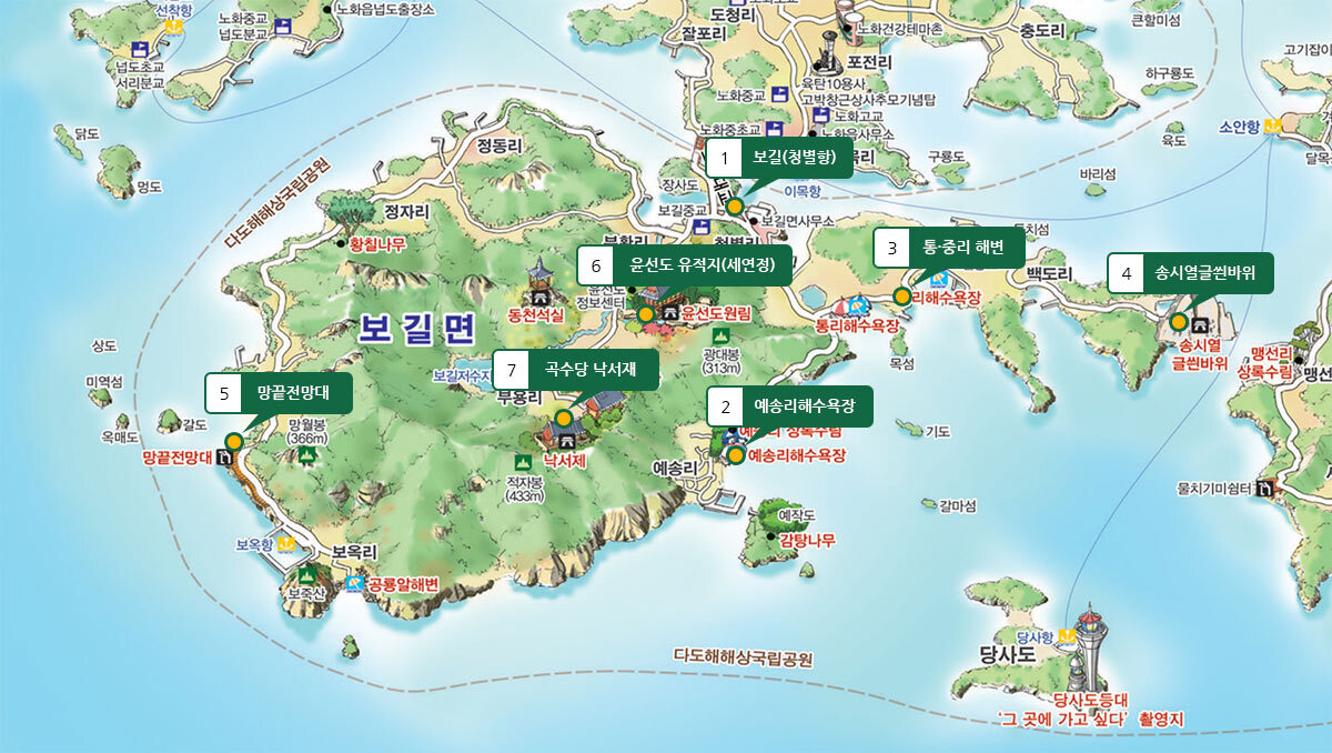 보길도에는 여러 종류의 해빈(海濱)[2]이 있다. 모래만으로 이루어진 사빈(砂濱, sand beach)은 해수욕장으로 이용되는데, 중리, 통리 해수욕장 등이 있다. 역(礫)으로 구성된 비치를 역빈(礫濱, single beach)라 하며 역시 해수욕장으로 이용된다. 자갈(몽돌) 해안이라고도 하는데 예송리 해수욕장이 이에 해당한다. 보옥리는 ‘공룡알 해변’으로 불리는데 공룡알처럼 생긴 돌들로 이루어진 역빈 해안이다. 예송리와 보옥리는 외해에 접해 있어 역빈 해안 발달에 유리한 조건을 갖추고 있다.