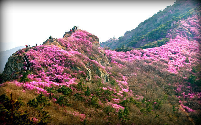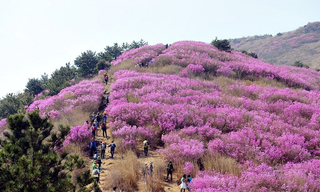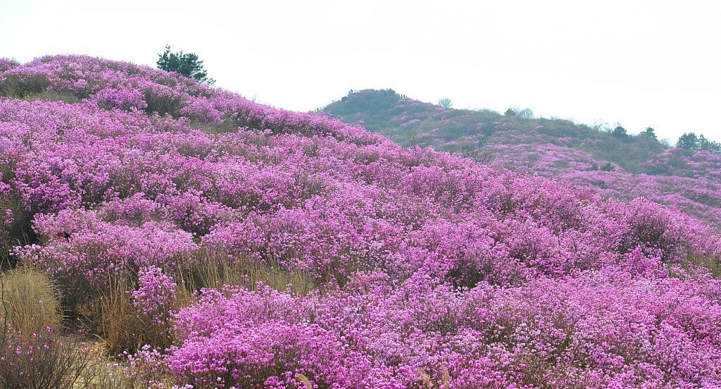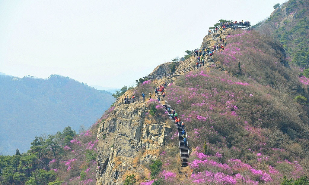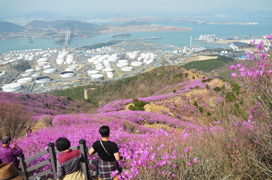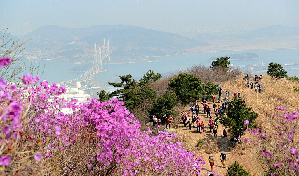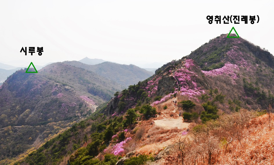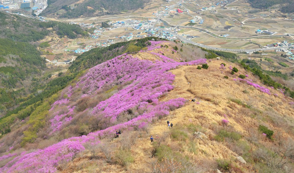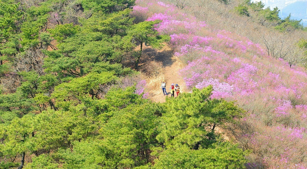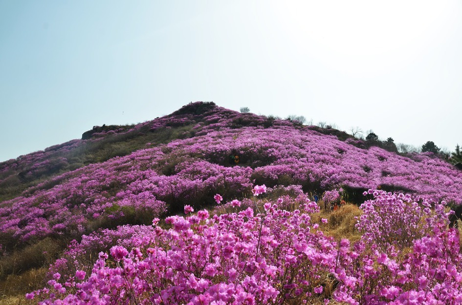 영취산은 축구장 140개의 넓이를 자랑하는 전국 3대 진달래 군락지 영취산은 4월이 되면 진달래로 온 산이 붉게 타오른다. 매년 영취산 진달래 축제가 개최되고, 축제 기간 중에는 산신제, 산상음악회 등 다채로운 행사가 상춘객들에게 볼거리를 제공한다. 봄이 되면 꽃을 통해 봄의 새 기운을 맞이하려는 사람들의 '지극 정성한 의례'가 곳곳에서 벌어진다. 우리나라 3대 진달래 군락지 중의 하나인 영취산(靈鷲山)도 매년 4월 초순경 진달래 축제를 열어 그 붉은 기운을 함께 기리고 있다. 흥국사를 옆으로 하고 등산로를 30분 가량 올라와서 보게 되는 영취산 자락은 분홍색 물감을 뿌려 놓은 듯 한 착각을 불러일으킬 정도로 만개한 진달래꽃이 보는 사람의 탄성을 자아낸다. 진달래꽃밭 사이에서 벌어지는 각종 행사도 관광객들의 발길을 끄는데, 영취산 진달래축제의 정신적인 지주 역할을 하는 산신제가 영취산 진달래축제의 주축을 이루는 행사이다.