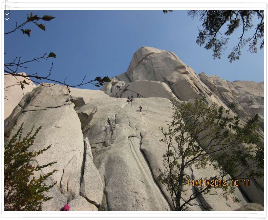 울산바위에 암벽등반하는 사람들이 바위에 매달려 있습니다