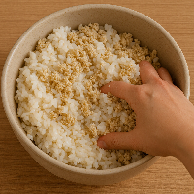 – 손으로 잘 주물러 밥알과 누룩이 골고루 섞이도록 해줍니다.