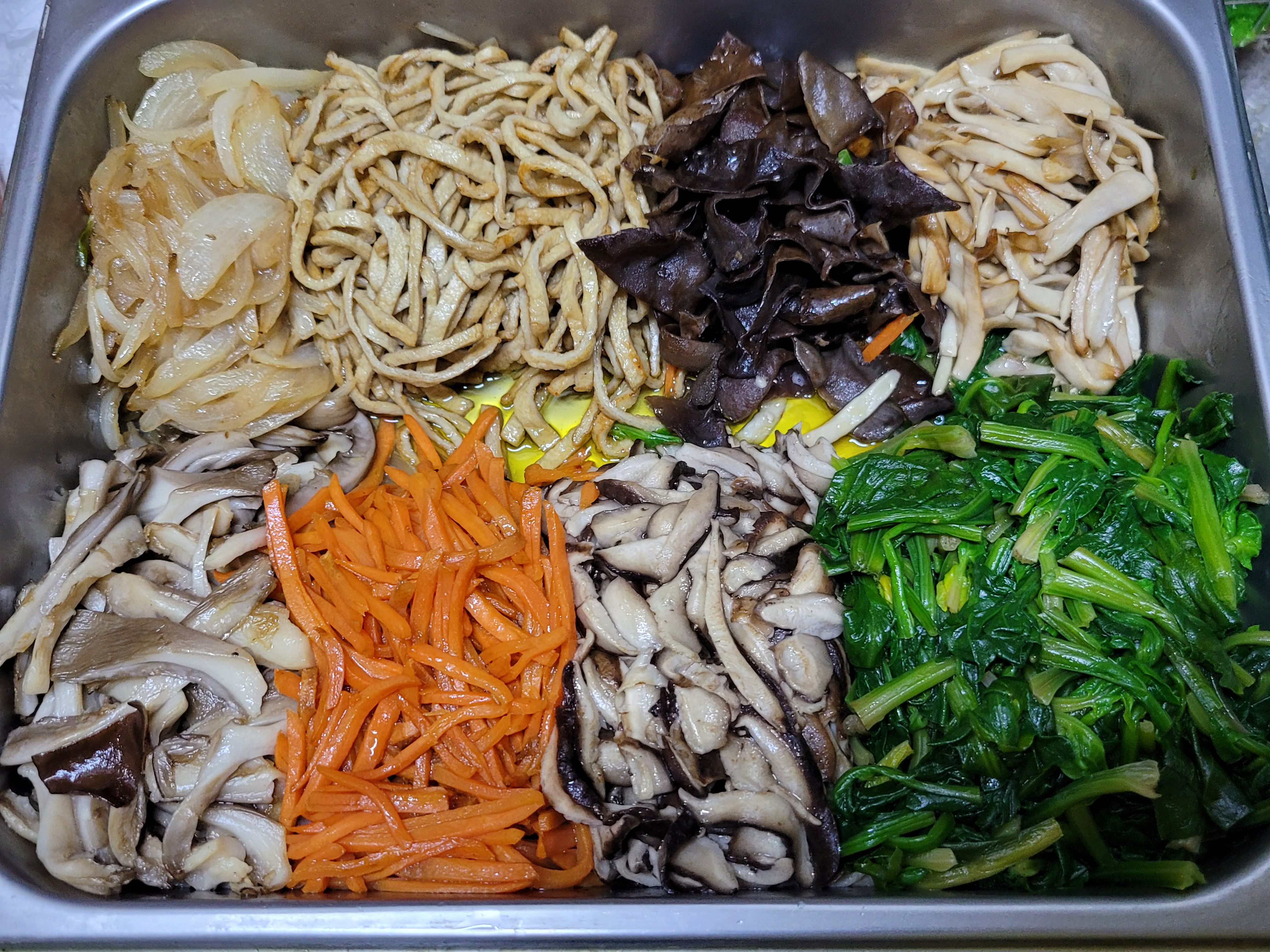 지인이 산에가서 직접 따다준 느타리 버섯과 목이버섯 볶고 표고버섯 송이버섯 볶고 시금치 무치고 당근어묵. 양파 볶아주고 식혀줍니다