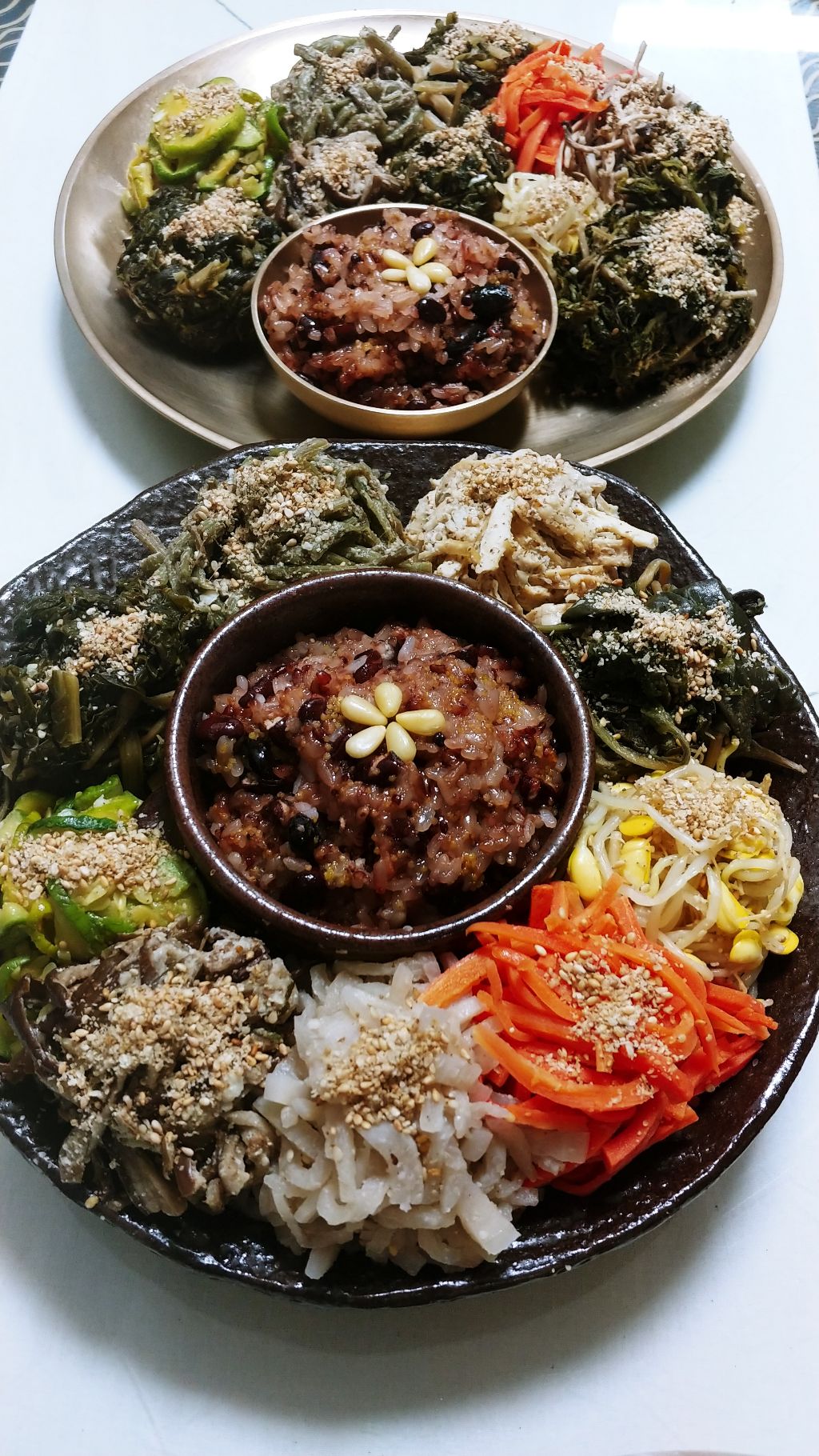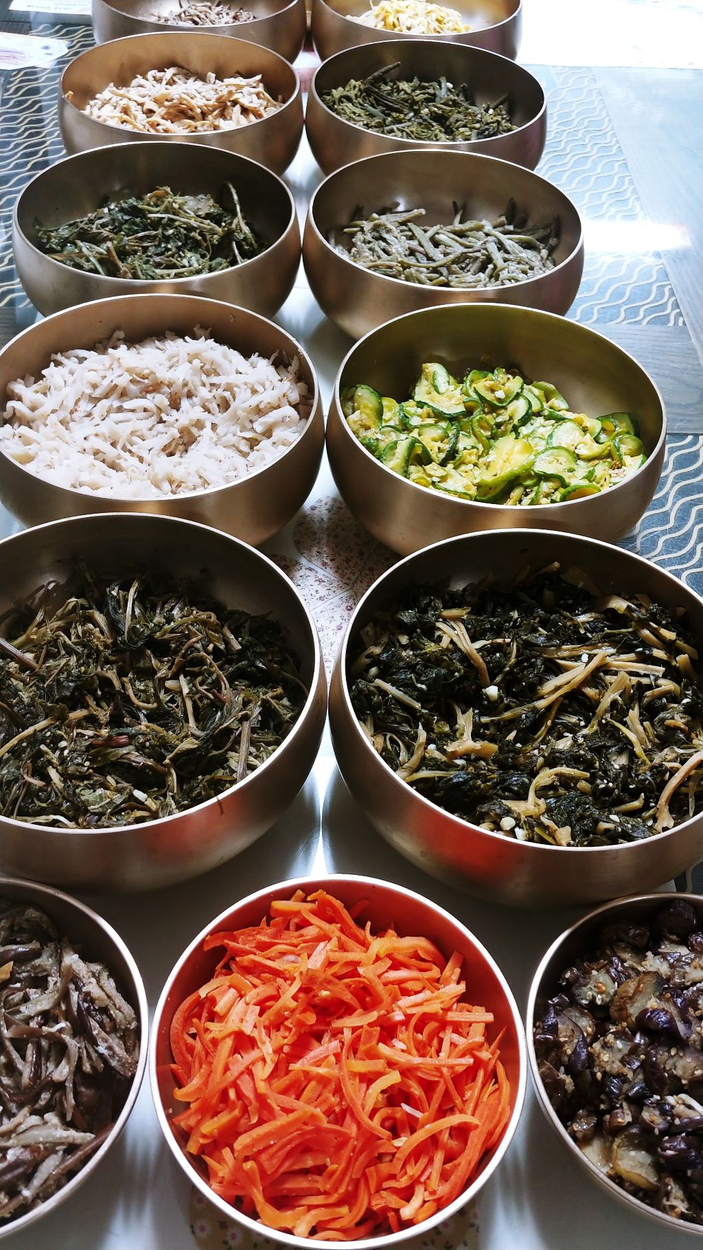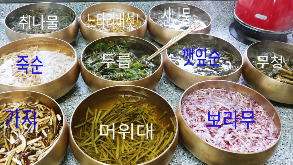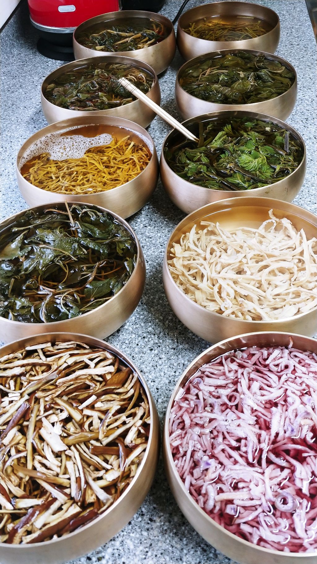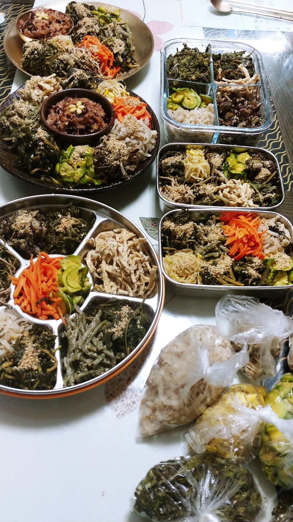 유기 그릇에 담아 놓으신 나물들이 한인물 합니당..