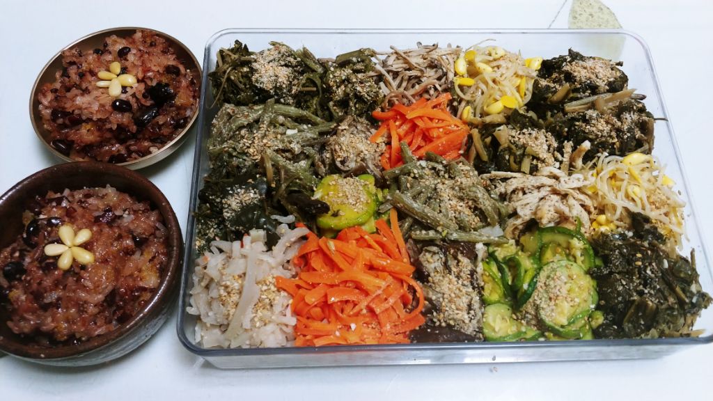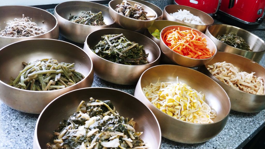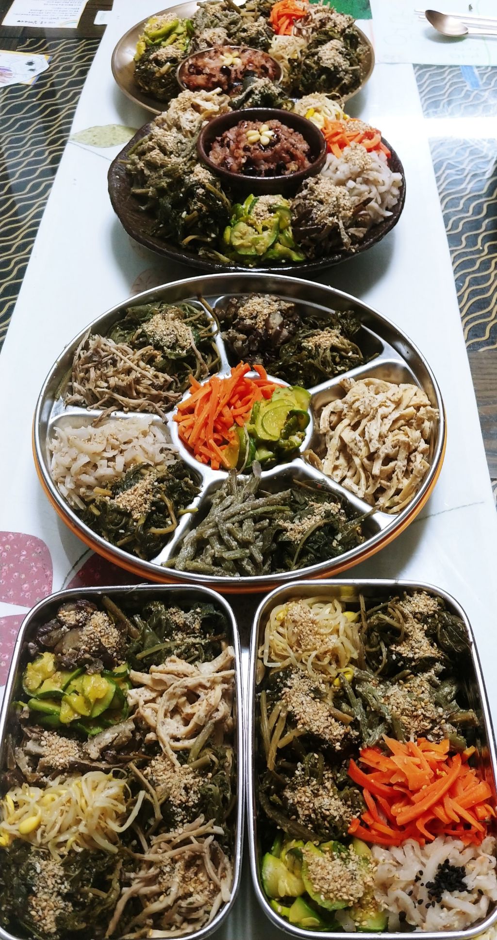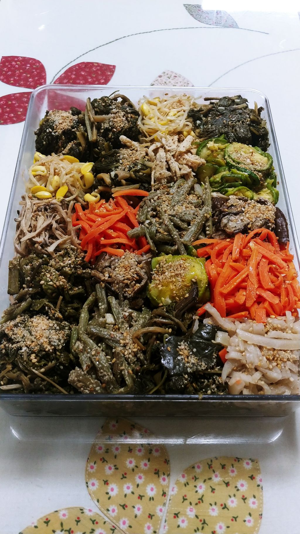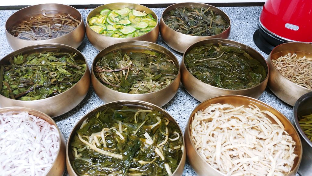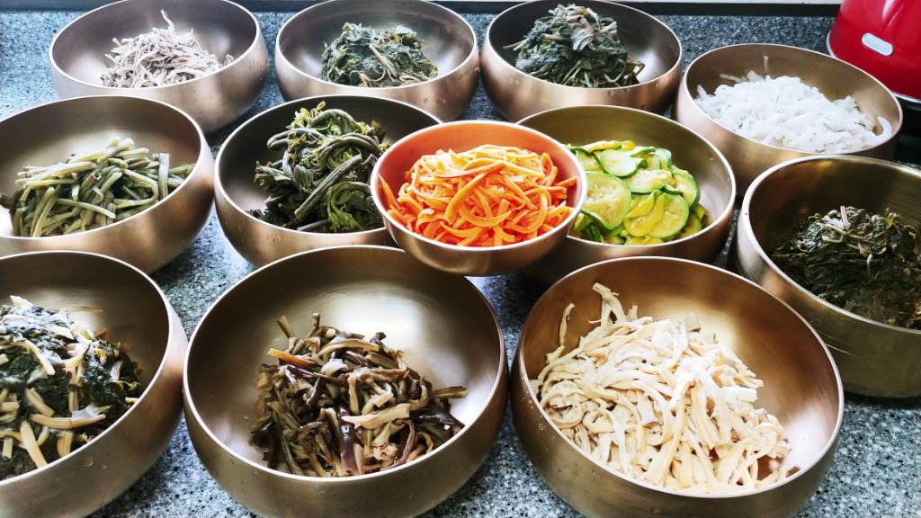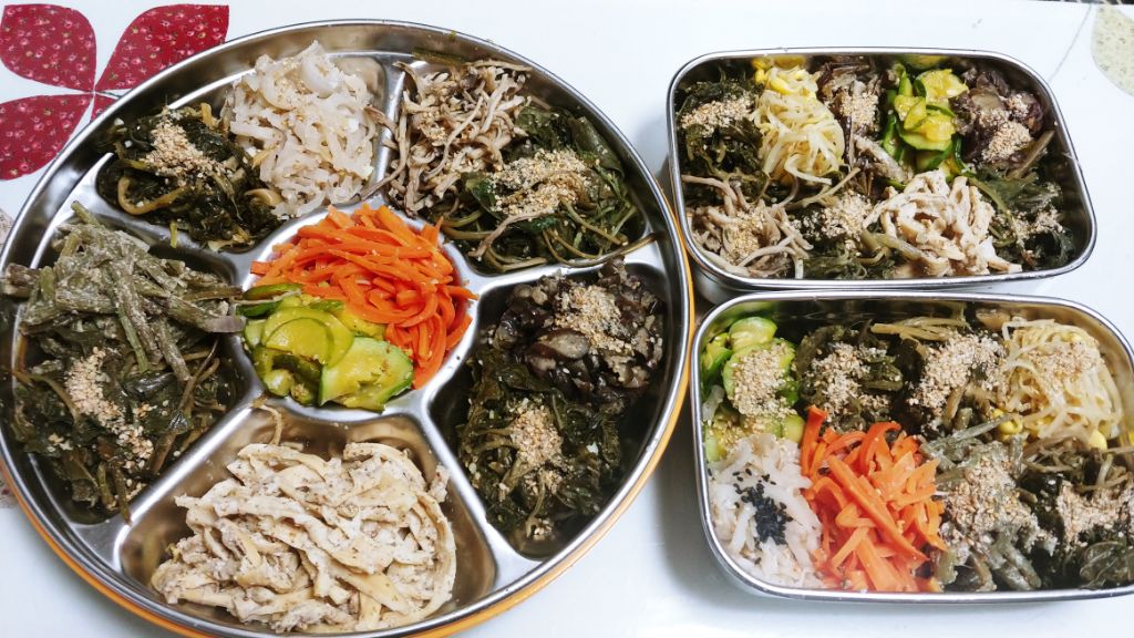 유기 그릇에 담아 놓으신 나물들이 한인물 합니당..