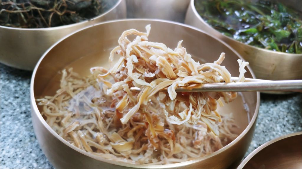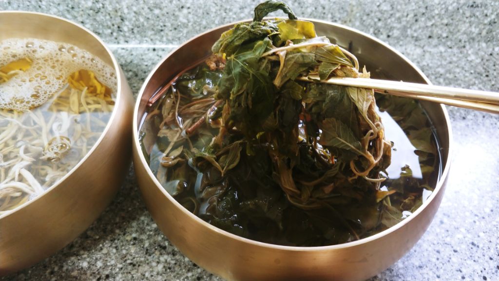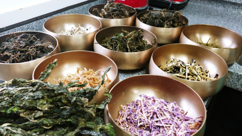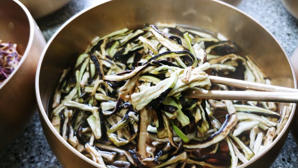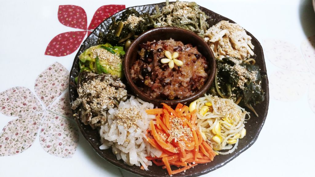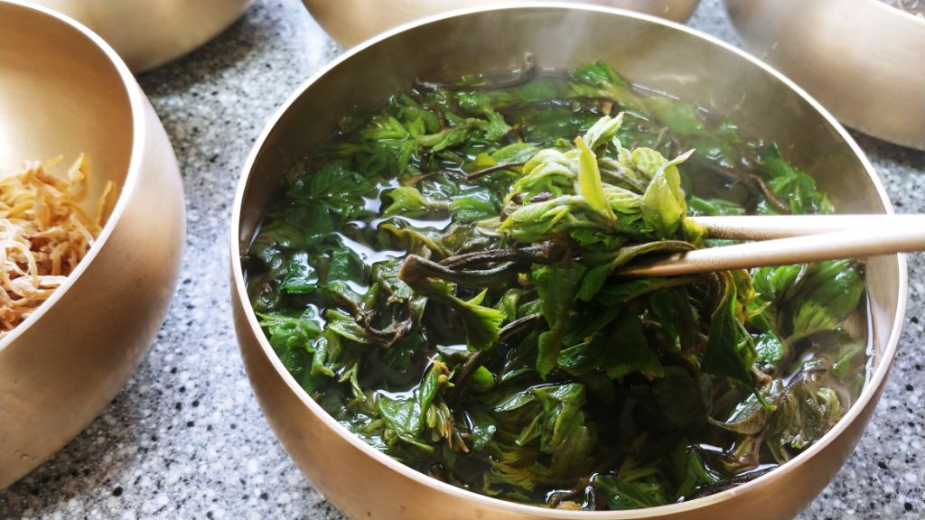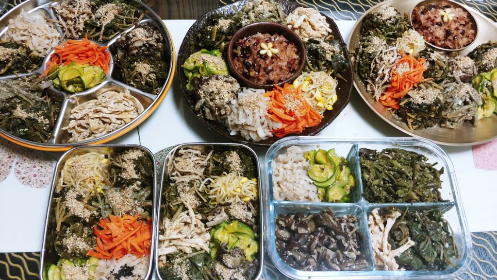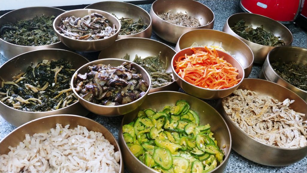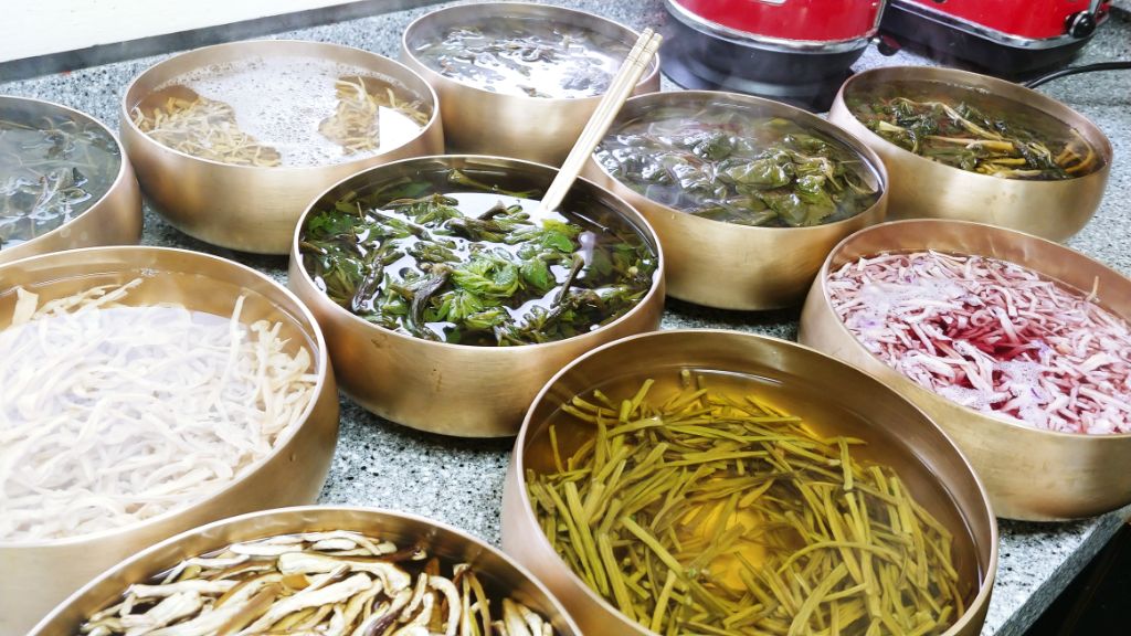 유기 그릇에 담아 놓으신 나물들이 한인물 합니당..