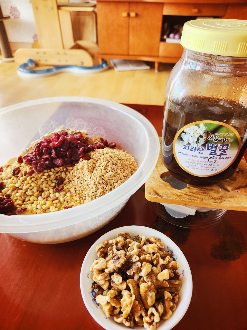 병콩ㆍ땅콩ㆍ 호두ㆍ잣ㆍ아몬드슬라이스ㆍ베리ㆍ꿀ㆍ오미자청 ㆍ합방시커.촉촉하게 속을만들어주어요