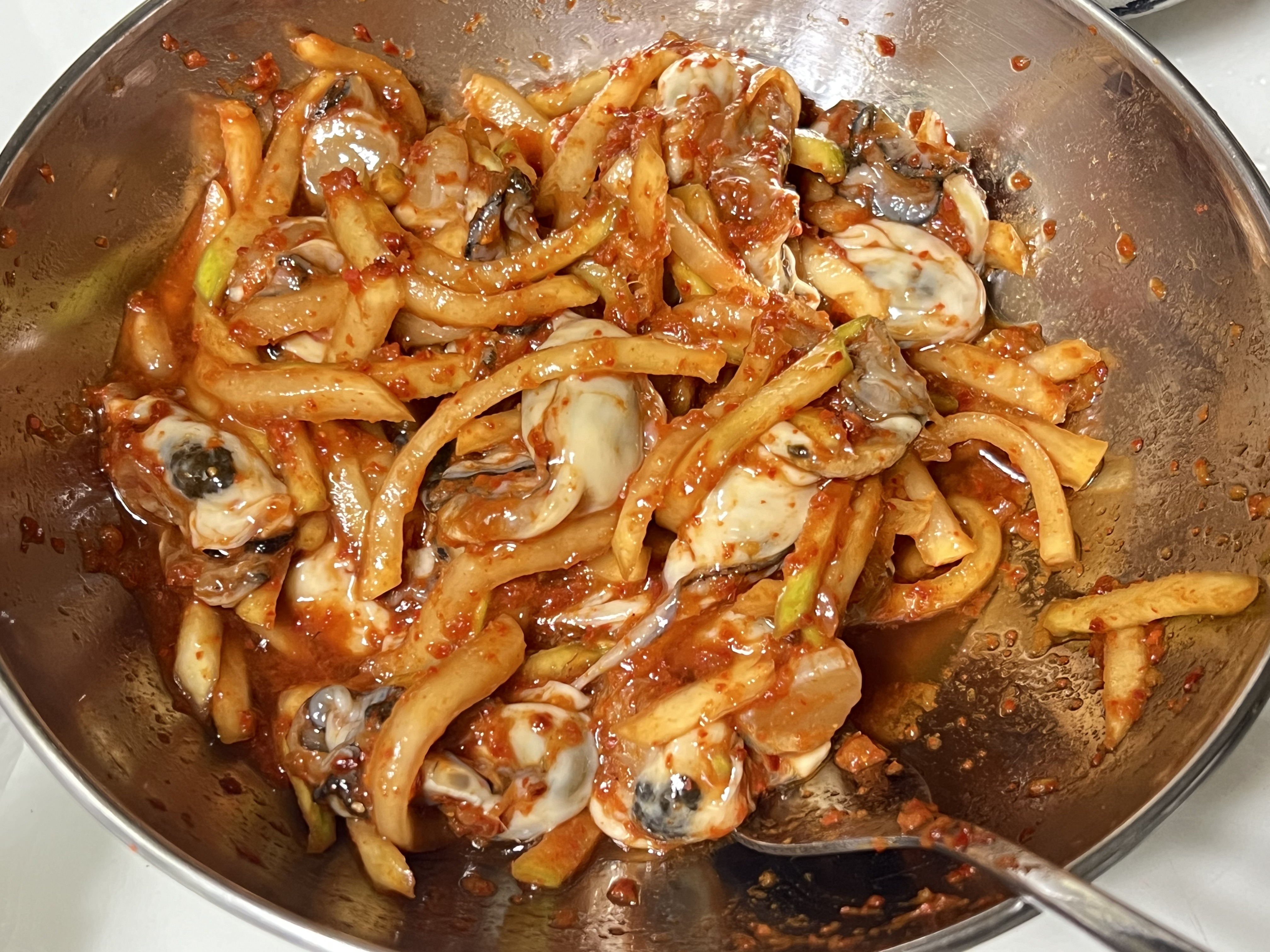무채 버무린거 좀 덜어서 물기뺀 굴 넣고 마무리로 버물버물